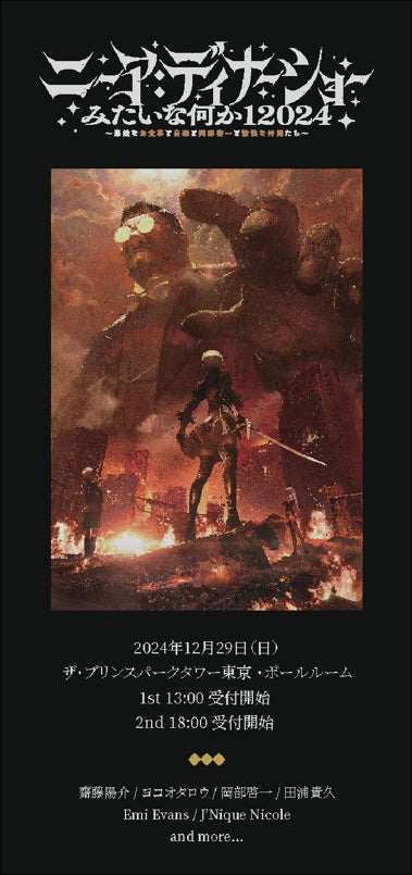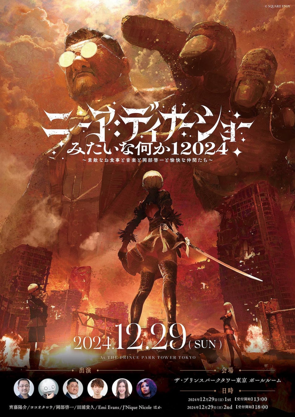 株式会社スクウェア・エニックス(本社:東京都新宿区、代表取締役社長:桐生 隆司、以下スクウェア・エニックス) は、2024年12月29日にザ・プリンスパークタワー東京 ボールルームにて『ニーア:ディナーショーみたいな何か 12024 〜素敵なお食事と音楽と岡部啓一と愉快な仲間たち〜』を開催します。現在、スクウェア・エニックス e-STORE にてチケット先行抽選受付中となっております。