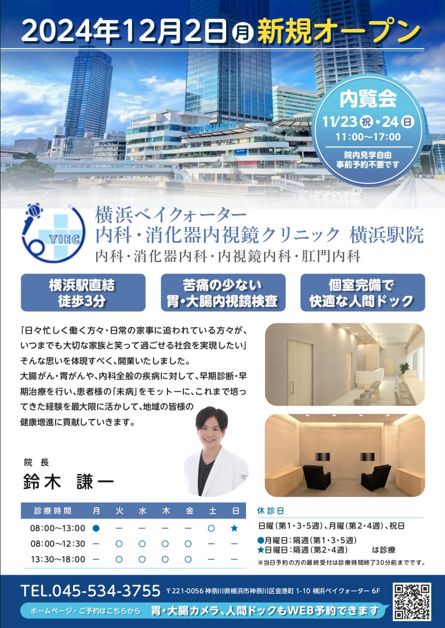11月23日(土)・24日(日)に内覧会の開催が決定!! 横浜駅直結【徒歩3分】、横浜ベイクォーター内に内科・消化器内科、健診・人間ドックを行うクリニックが12月2日、新規オープン!