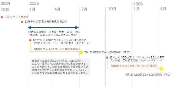 10月2日のメディア発表会以降、有識者、政府関係者と年末までにガイドラインver1.0と ロゴ、制度を構築予定です。それらを年明けに発表し、その後約半年の間に審査員教育・試験、認定審査機関を準備し、2025年7月から審査を開始する予定です。