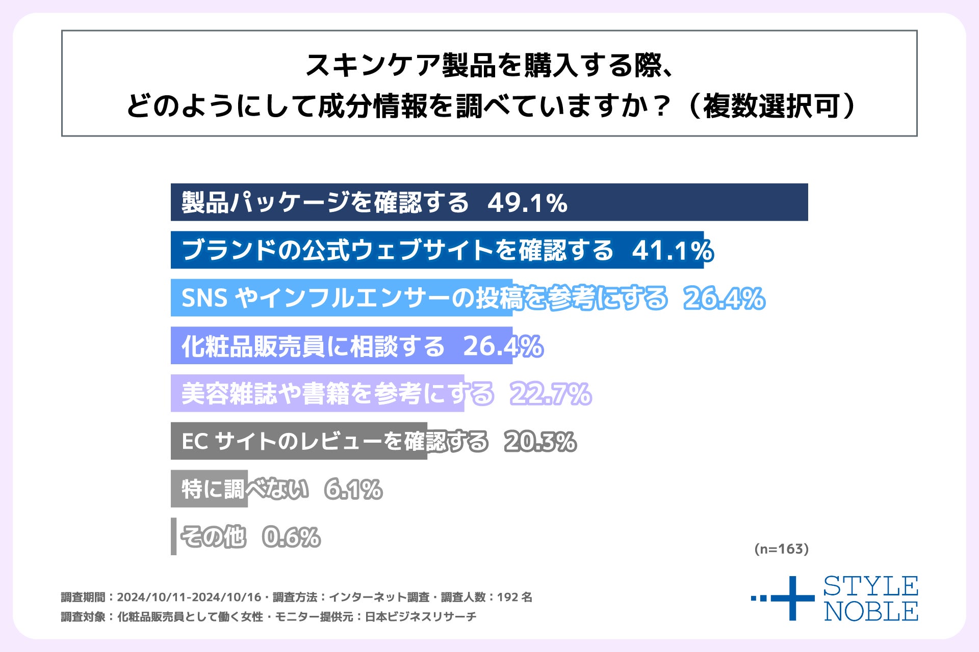 ・化粧品販売員の多くが、スキンケア製品を購入する際に「製品パッケージ」や「公式ウェブサイト」で成分情報を確認している