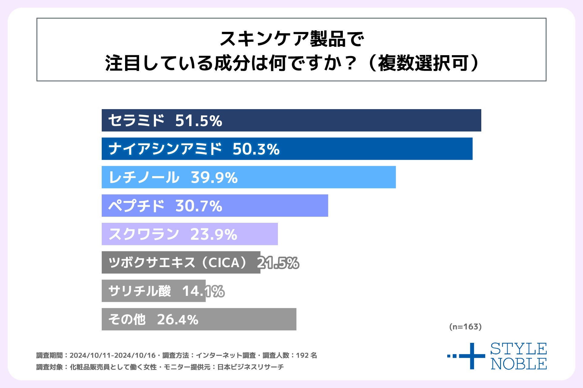 化粧品販売員が注目しているスキンケア製品の成分、1位は「セラミド」、2位は「ナイアシンアミド」3位は「レチノール」!ノーブル株式会社が化粧品販売員を対象に「スキンケア製品の成分」に関する調査を実施!
