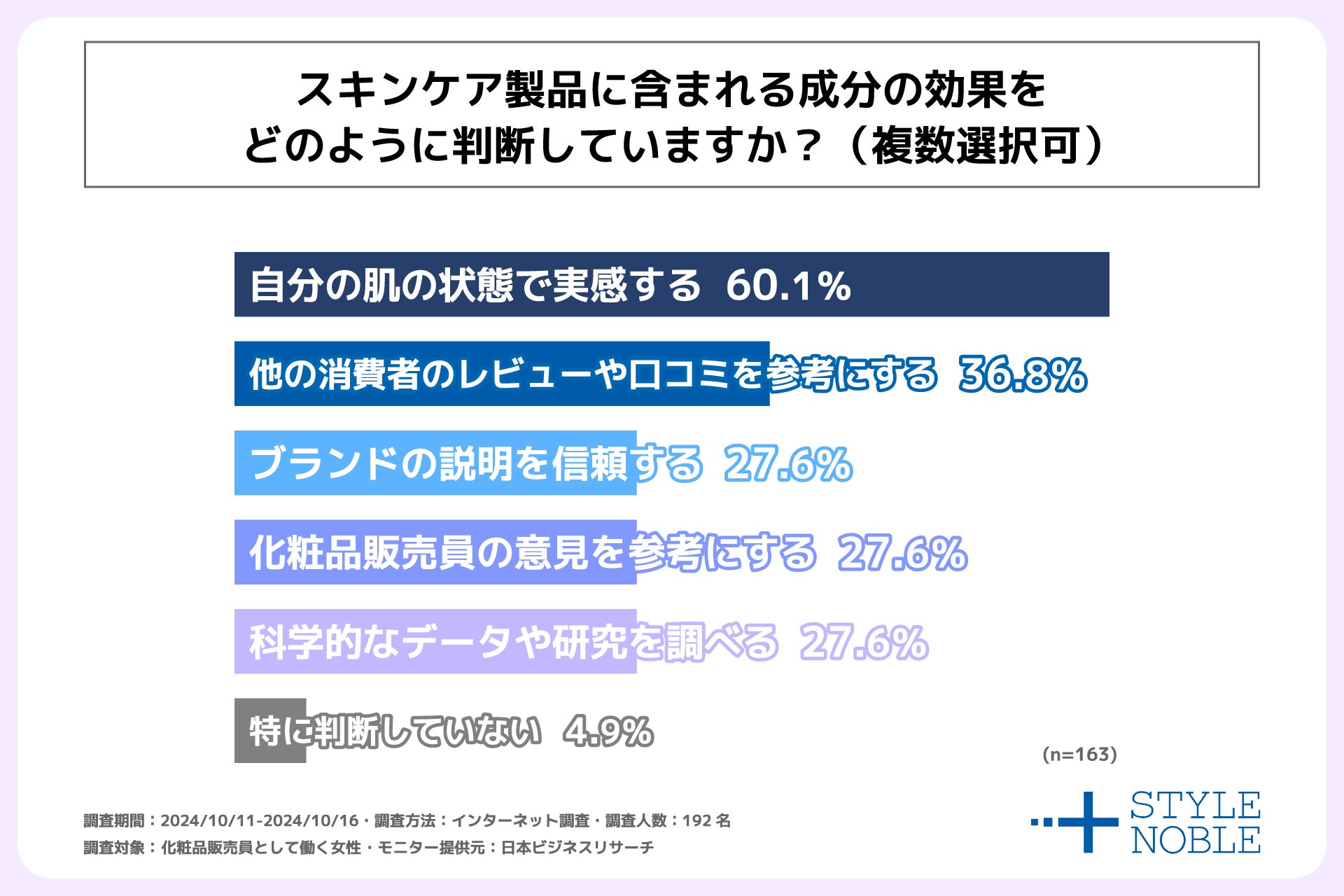 調査の最後、スキンケア製品を選ぶ際に成分を重視していると回答された方に「スキンケア製品に含まれる成分の効果をどのように判断しているか」を尋ねる設問で、最も多かった回答は「自分の肌の状態で実感する」で60.1%でした。次いで、「他の消費者のレビューや口コミを参考にする」が36.8%、「ブランドの説明を信頼する」「化粧品販売員の意見を参考にする」「科学的なデータや研究を調べる」がそれぞれ27.6%と続く結果になりました。この結果から、スキンケア製品を選ぶ際に成分を重視している化粧品販売員の多くは、自らの肌の反応から成分の効果を判断している、ということがわかりました。