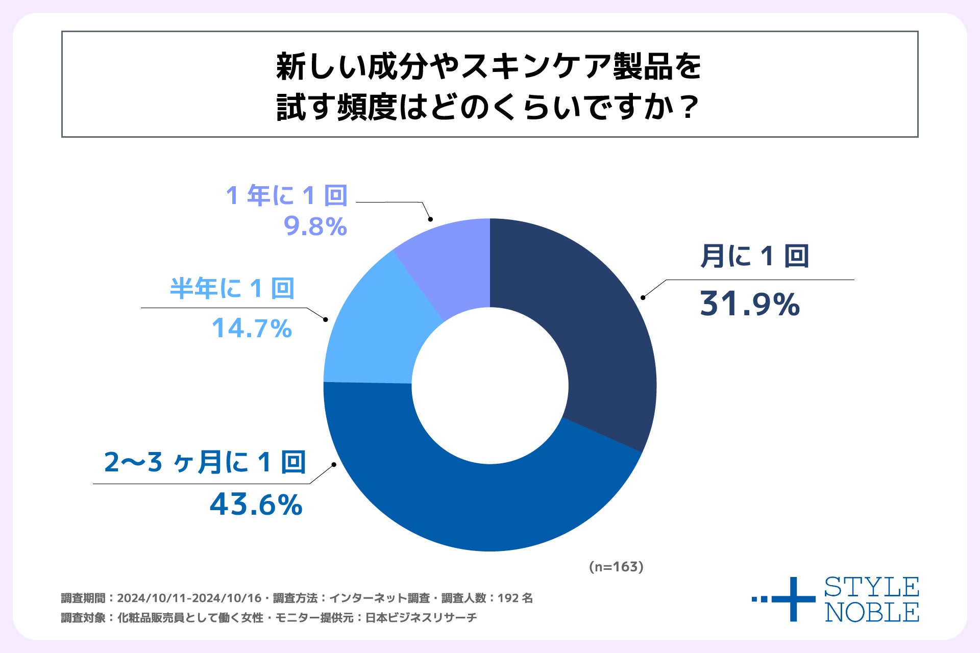 また、スキンケア製品を選ぶ際に成分を重視していると回答された方に「新しい成分やスキンケア製品を試す頻度」を尋ねる設問への回答では、「2〜3ヶ月に1回」が最も多く43.6%、次いで「月に1回」が31.9%と続く結果となりました。これらの回答を合計すると、回答率は75.5%となり、スキンケア製品を選ぶ際に成分を重視している化粧品販売員の7割以上が少なくとも3ヶ月に1回は新しい成分やスキンケア製品を試している、という事実が判明しました。