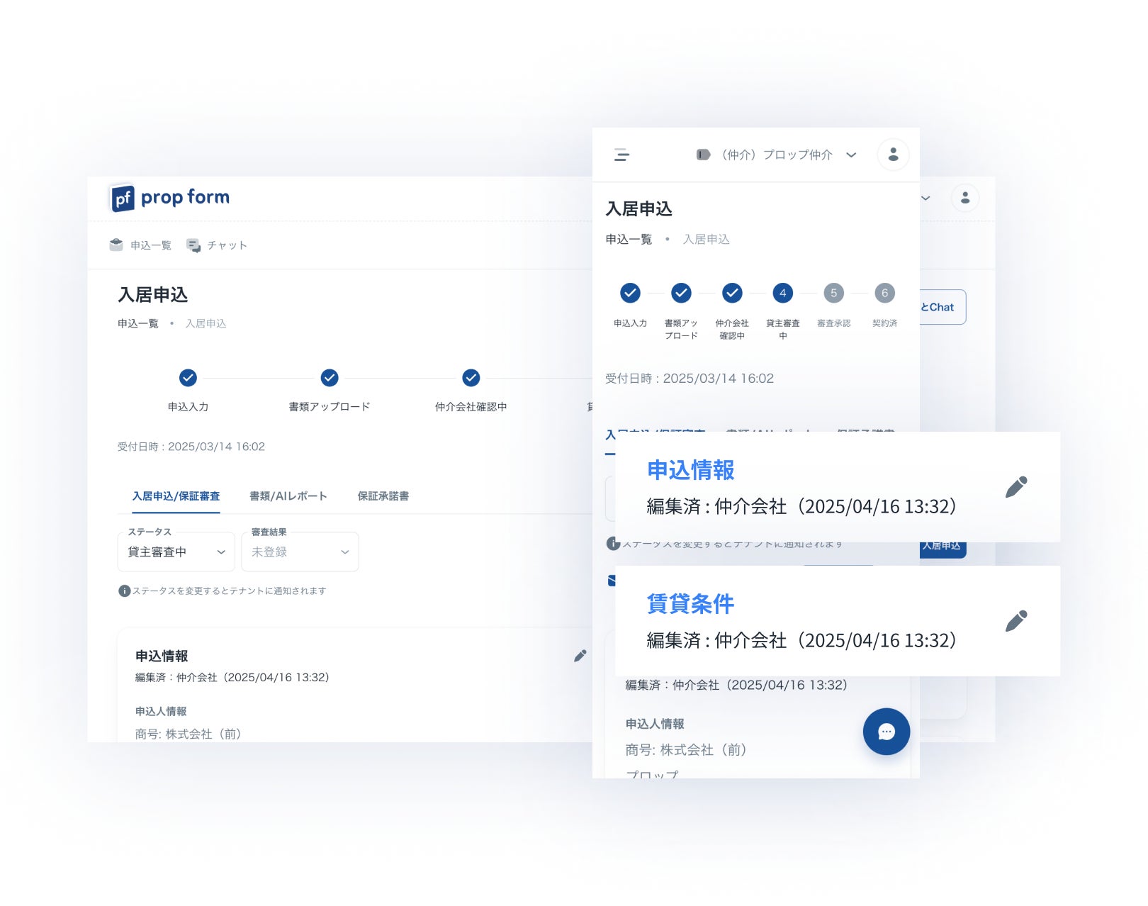 本機能は、プロップフォームの入居申込機能と連携することで、申込から入居審査までのすべての手続きをWeb上で完結できます。
