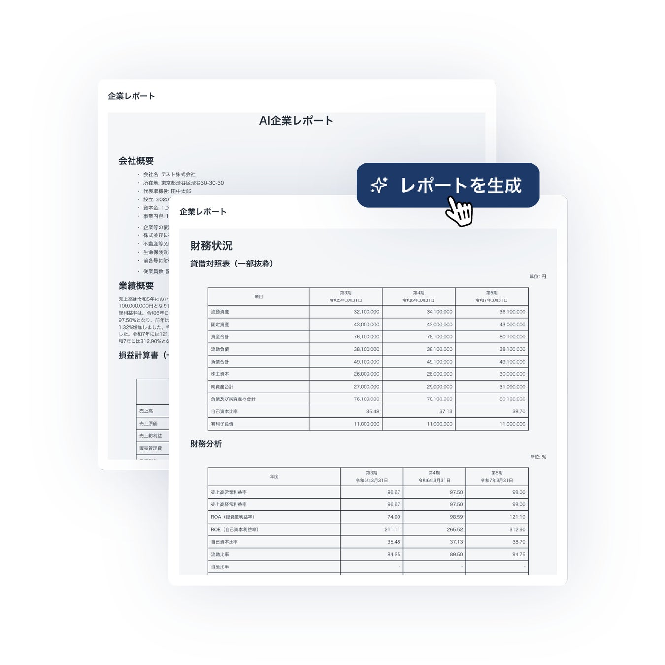 「AI企業レポート」は、テナントが提出した申込書類をAIが解析し、企業概要・直近決算の比較・主要財務指標をまとめたレポートを自動生成する機能です。