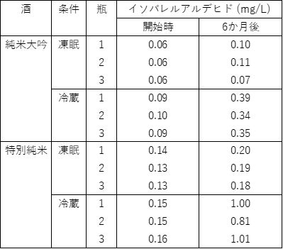 表 凍眠凍結および冷蔵貯蔵した清酒の貯蔵前後のイソバレルアルデヒド濃度