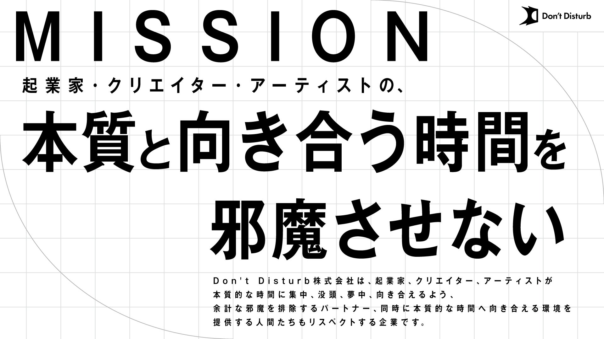 この度、「起業家・クリエイター・アーティストの、本質と向き合う時間を邪魔させない。」というミッションを掲げ、エンターテインメント×スタートアップ企業に特化したバックオフィスBPOサービスを提供する「Don’t Disturb株式会社」(以下「Don’t Disturb」)を設立いたしました。