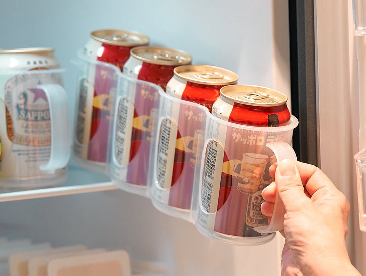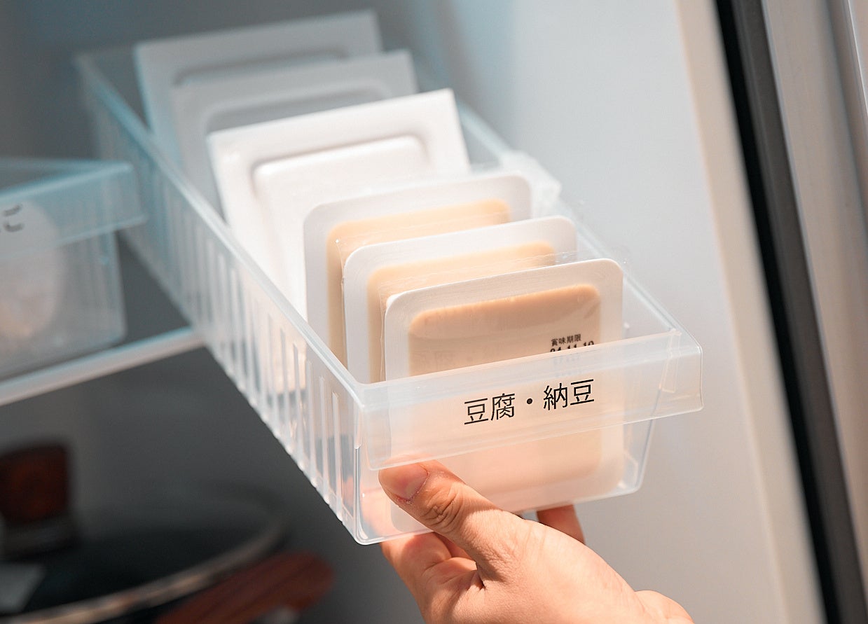 缶ビール、豆腐と納豆など同じものが何個もある場合は、奥行のある中身の見えるケースに収納しラベリングしておくと家族みんなが残量に気がつき、買い足し出来るので便利。また朝食セットなど、同じタイミングで使用するものはケースでまとめて収納すると、時短にもなり便利です。