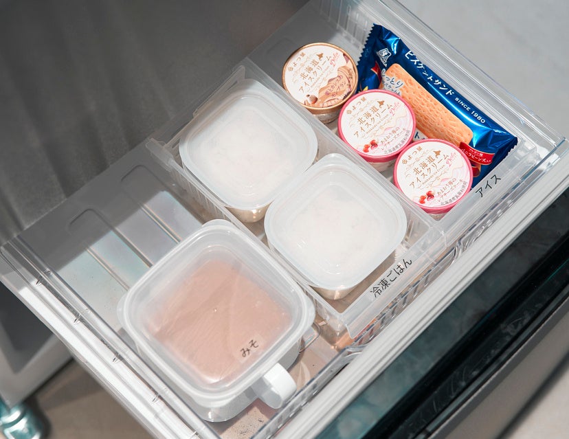 冷凍食品も野菜室と同じです。立てて収納するとなにがいくつあるのか、見やすくなります。特に冷凍食品の袋は、ほとんどが横にも食品名が印字されているので、ラベルがなくても中身が把握でき便利です。お肉なども重ねてしまうと、中身がわからなくなってしまうので、中身が見えるケースに入れて立てて収納してください。また上から覗き込んでも見やすいようラベルを貼る際は、上面に貼るのがポイントです。