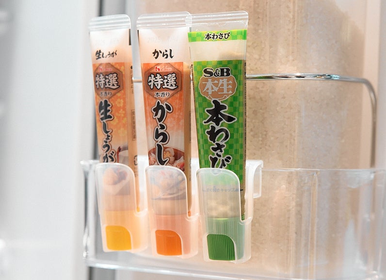 マヨネーズやケチャップ、からし、わさび、しょうがのチューブ等は、立てて収納することで、どこになにがあるか一目瞭然に!ドアポケットにつけるだけで、簡単に収納も増やせます。