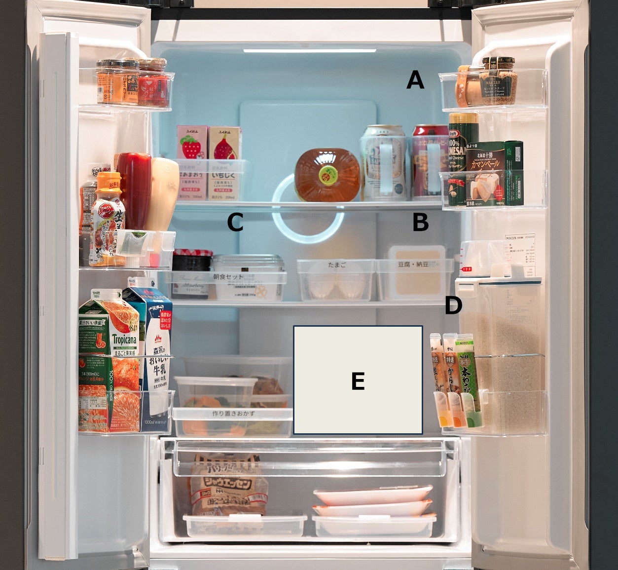 冷蔵庫は、一般的に上段は使用頻度が低く、賞味期限が長いものを入れ、日常的に使用するものを中段、下段にすぐに使うもの、作り置きおかず等を置くのがお勧めです。そして、冷蔵庫収納のポイントは大きく3つ!①グループわけ ②チューブは見やすく立てて収納 ③鍋1つ分が入るスペースを空けておく。