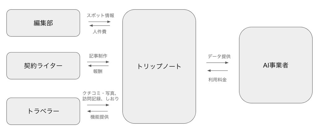 このたび提供する観光データ連携サービスを通じて、AI事業者は、連携された観光データを用いて人々の役に立つAIサービスを実装できます。一方、データを提供するトリップノートは、いただいた利用料金をもとに、より観光情報の収集を促進するためにスタッフの拡充や報酬体系の改善、機能開発を行います。これにより持続可能なメディアサービスの実現に近づくと考えています。