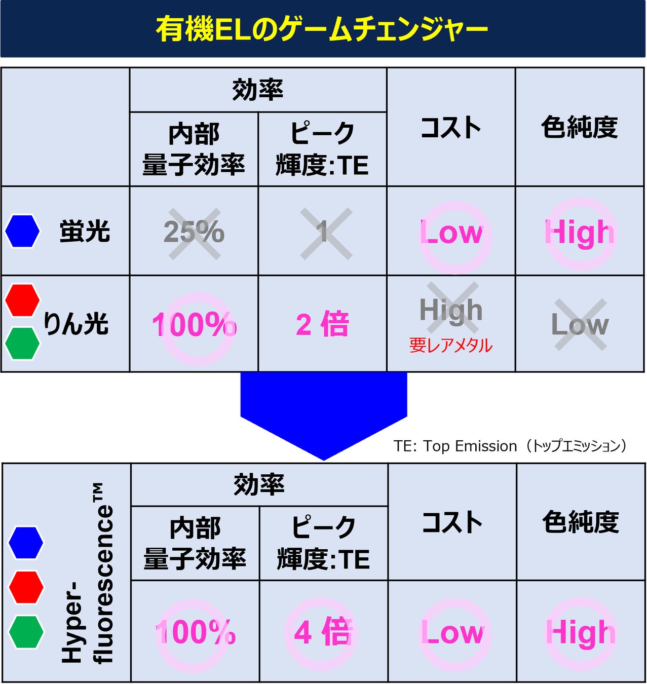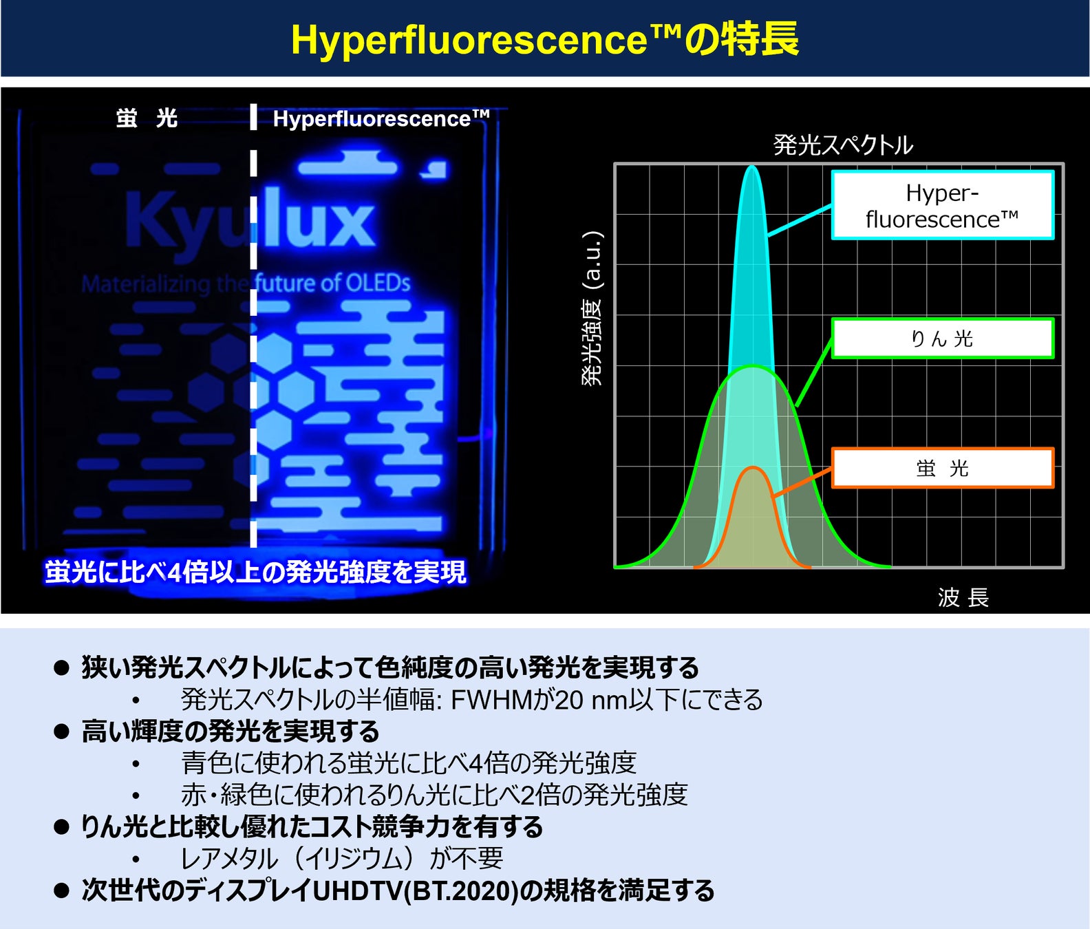 ※³ Hyperfluorescence™:TADFを蛍光発光材料と組み合わせることで、TADFから蛍光分子にエネルギーを移動させて発光させる第4世代有機EL発光技術。高効率、長寿命およびレアメタルフリーで高色純度の発光を実現できる究極の発光メカニズム。