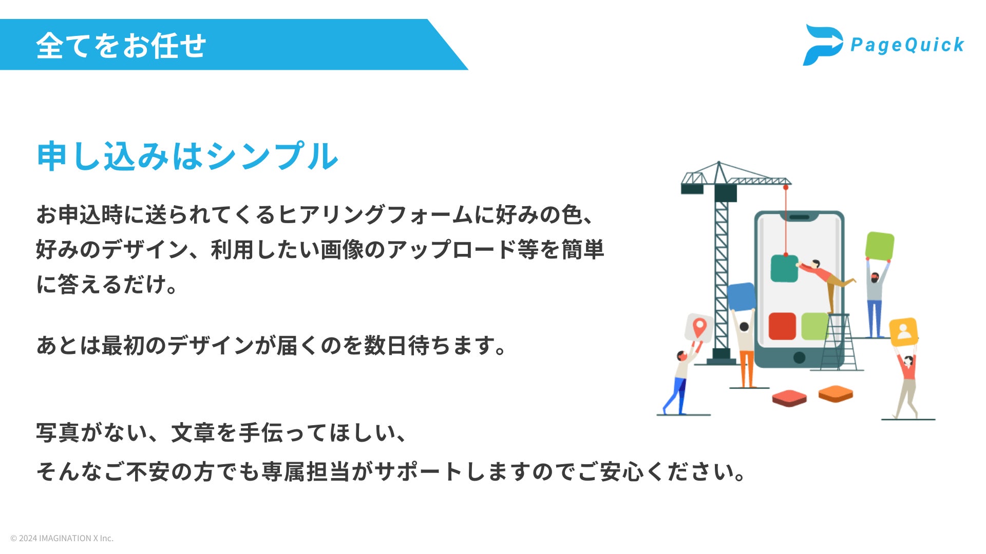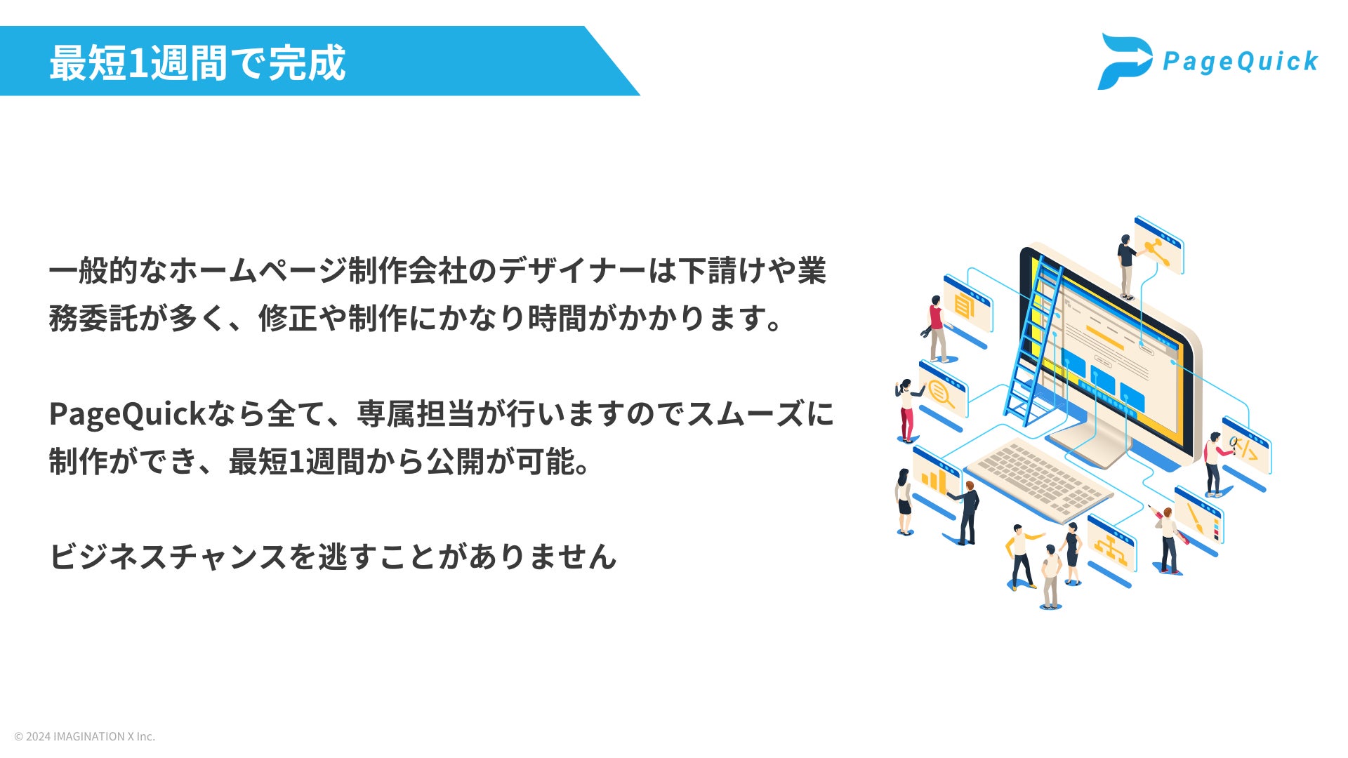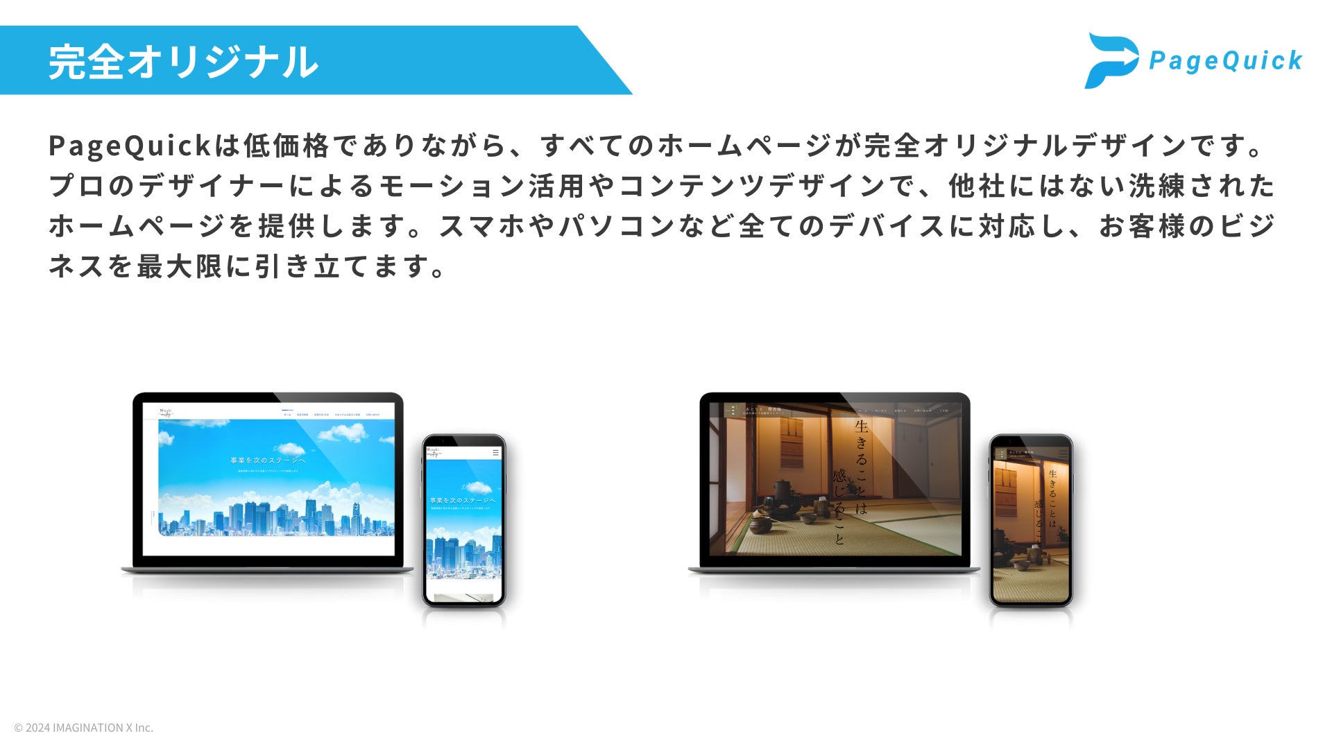 株式会社IMAGINATION X(本社:北海道札幌市、代表取締役:相庭 至)は、月額定額制ホームページ制作サービス「PageQuick(読み:ページクイック)」を、2024年9月23日(月)よりサービス提供開始いたしました。
