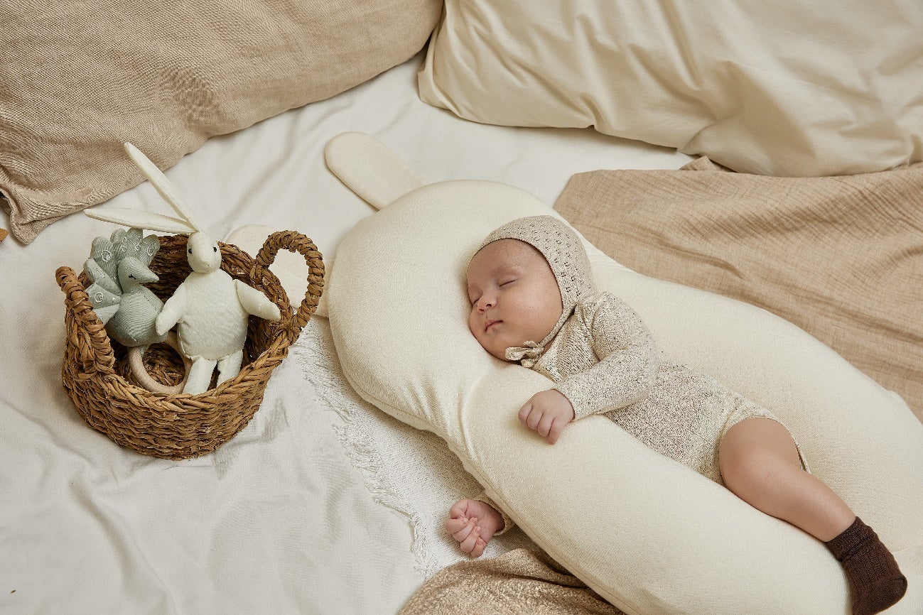 ユニースリープは、両サイドの抱き枕部分によって、赤ちゃんの手足が枕を抱く体勢を作り、予想できないタイミングでの寝返りのリスクを減らすことができます。赤ちゃんの身体に無理な圧が掛からない設計です。