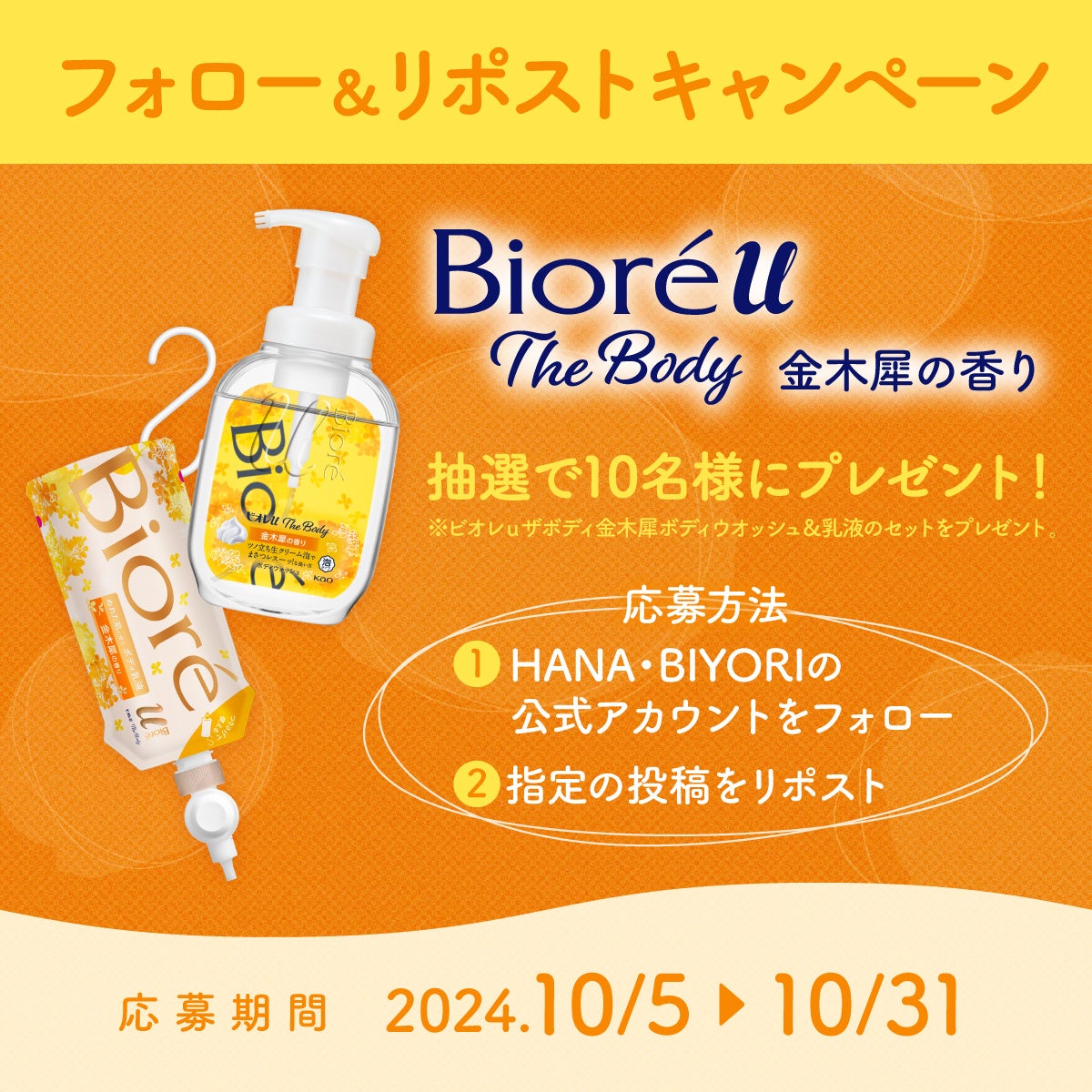 10月5日(土)~10月31日(木)の期間、 HANA・BIYORI公式X(@Hanabiyori8717)をフォローいただき、対象投稿を指定ハッシュタグを付けてリポストいただくと、抽選で10名様に『ビオレu ザ ボディ 金木犀の香り』シリーズが当たるキャンペーンを実施します。