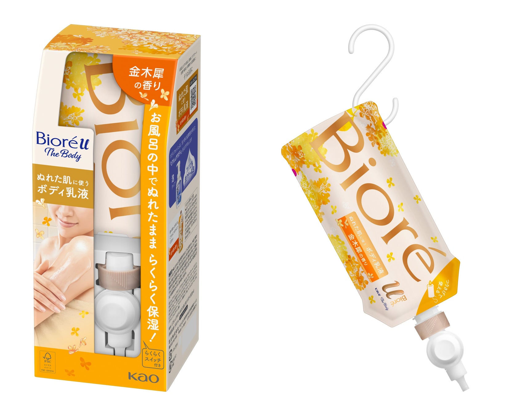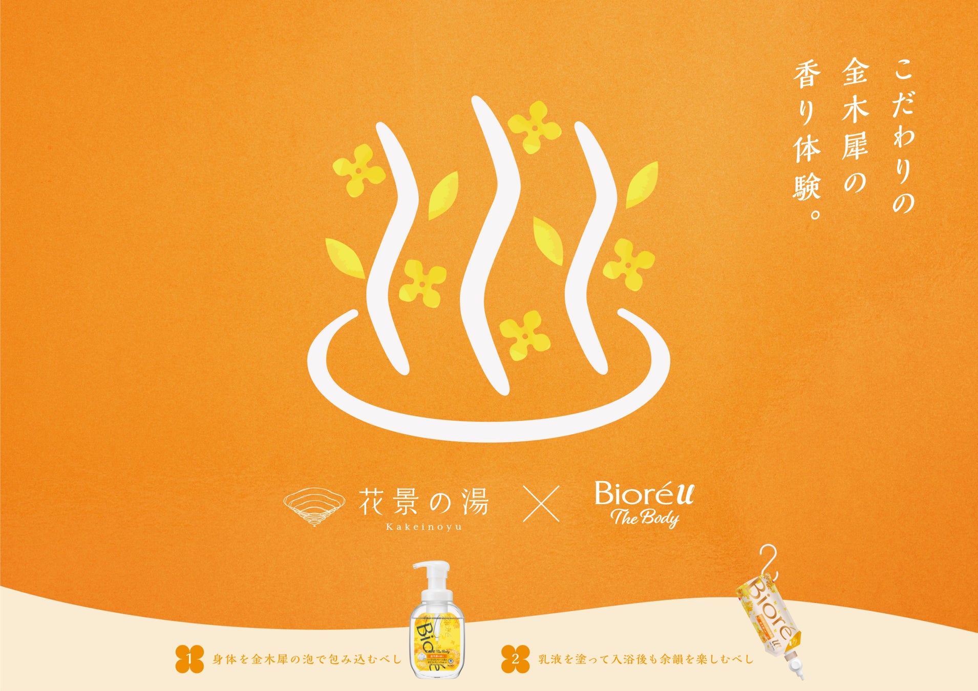 毎年秋になるとどこからともなく香ってくる金木犀。そんな秋の訪れを感じさせる 『ビオレu ザ ボディ 金木犀の香り』はこだわりの香り設計で、ふわっと気分ときめく自然な金木犀の香りに仕上げました。そしてこの度「ビオレu ザ ボディ」は、この香り高い金木犀の香りをより多くの方々に体験いただけるよう、 HANA・BIYORI内に2024年3月に新しく誕生した「花景の湯」にて、約1ヵ月間の期間限定で 『ビオレu ザ ボディ 金木犀の香り』シリーズを設置いたします。ボディウォッシュは男湯・女湯ともに設置し、さらに女湯には浴室内でぬれたままスーッと一気にボディケアができる乳液も出入口付近に設置します。