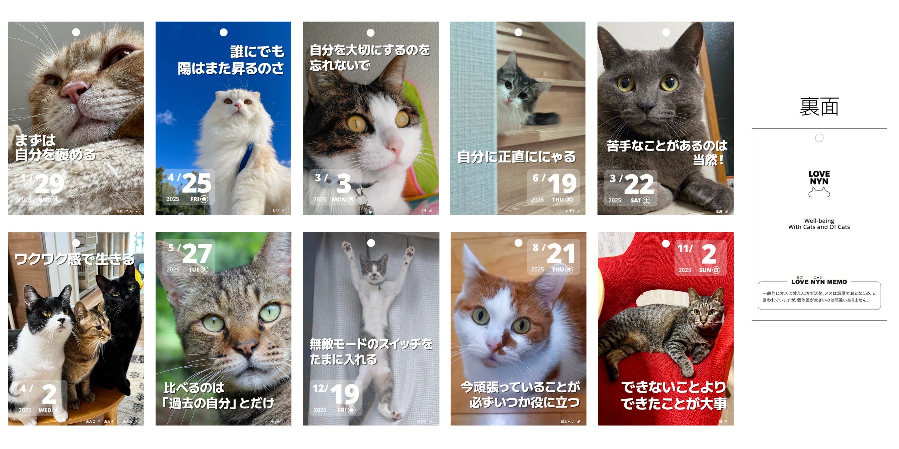「ニャンコの教え 日めくりカレンダー 2025」は、見るだけで癒しと元気をくれるニャンコたちが「自分らしくいればいいじゃない」と教えてくれて、毎日をちょっと前向きな気持ちにしてくれるカレンダーです。裏面にはニャンコたちをもっと知って、もっと愛したくなる一言メモ。そして、ご購入いただいた金額の3%が、より多くのニャンコの幸せのため保護ネコ譲渡の活動に寄付されます。まさにLOVE NYNプロジェクトの想いをこめた日めくりカレンダーです。