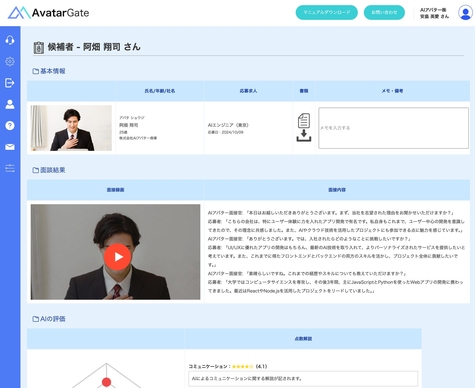・採用の負担軽減:AIアバターが面接を代行。採用業務をシンプル化でき、面接にかかる時間や人的負担を大幅に削減します。