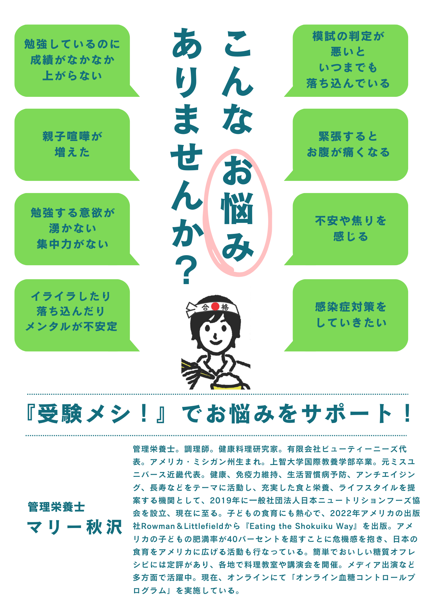 『受験メシ!』の食事法は、多くの親子に実践してほしい食育法ですが、本書にあえて 『受験メシ!』とのタイトルをつけたのは、受験期が親と子が将来に対して真剣に向き合う時期だからです。受験勉強を行うのは子どもであり、「親は見守るしかできない」と思いつつも、多くの親御さんは「もっと子どものためにできることはないか」と真剣に悩みます。その悩みを解消するのが、『受験メシ!』です。