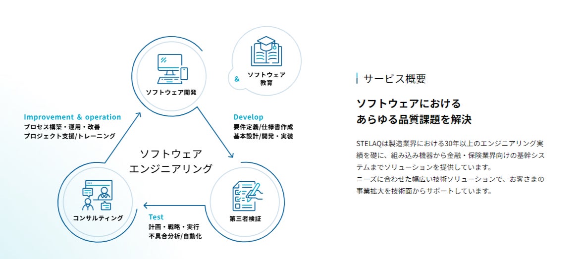 また、「ソフトウェア開発」「第三者検証」「国際規格適合コンサルティング」サービスのご案内とともに、企業理念や代表メッセージを公開し、STELAQが目指すものをイメージしていただけるサイトとしました。