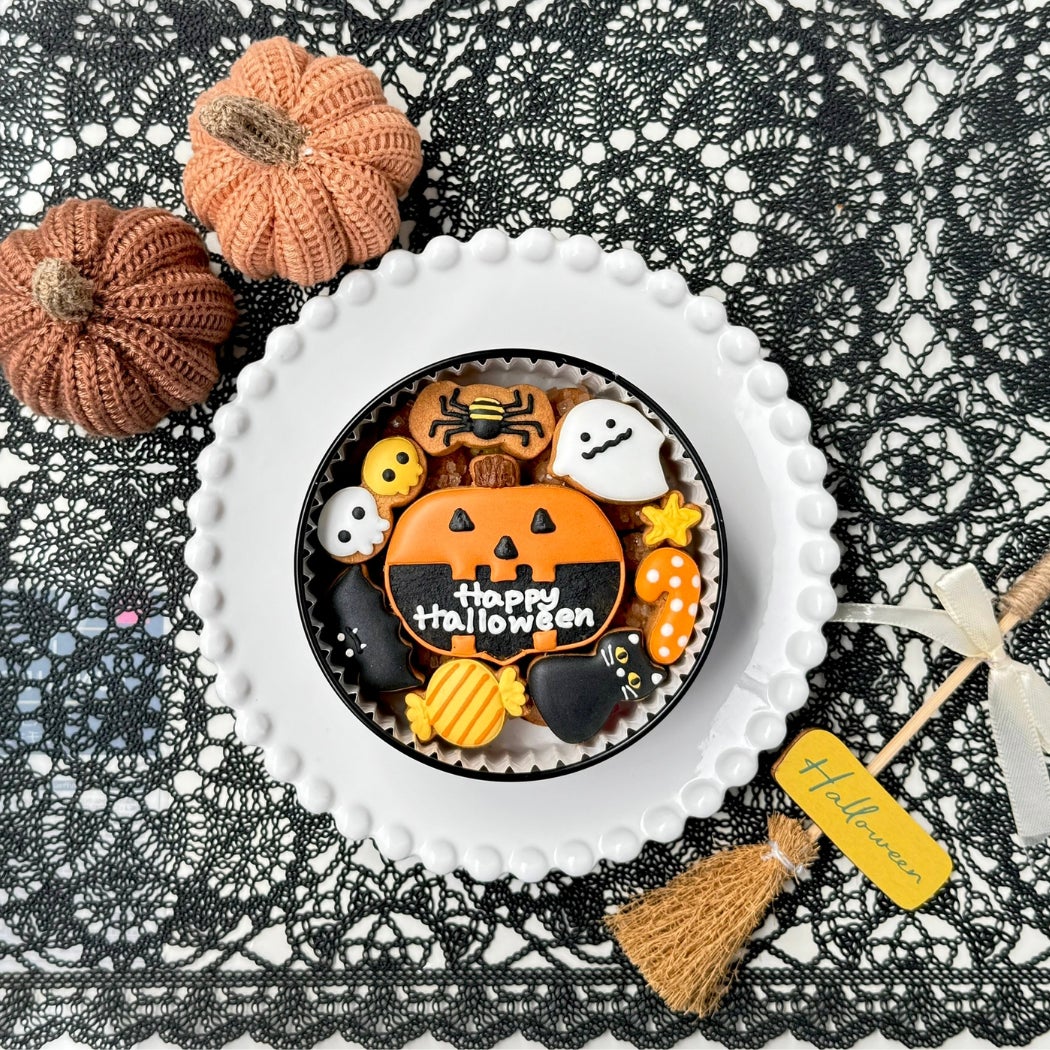 かぼちゃのメッセージクッキー×1、おばけ×1、星×1、キャンディスティック×1、黒猫×1、、キャンディ×1、こうもり×1、がいこつ×1、くも×1
