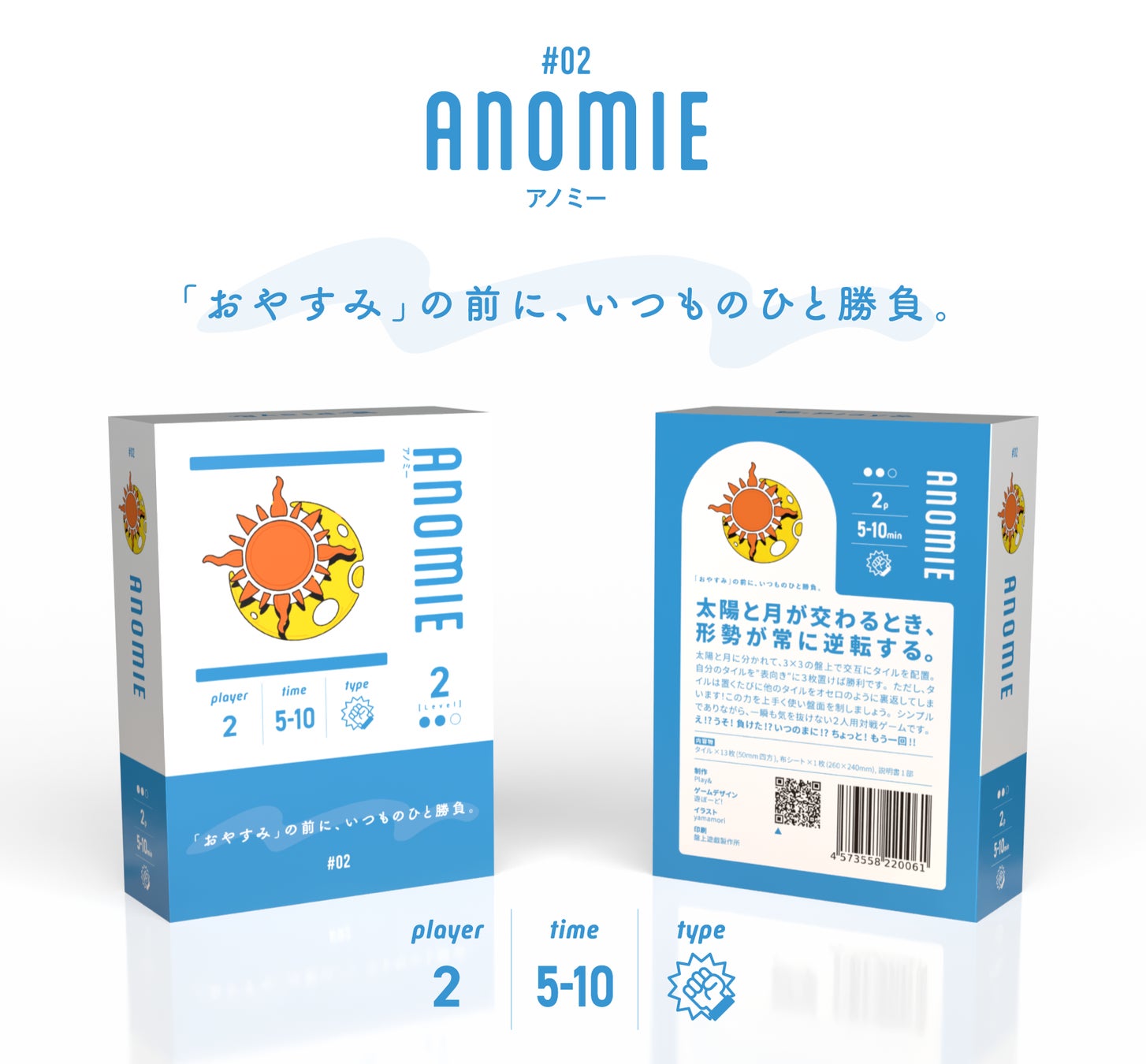 「ANOMIE」は、太陽と月のタイルを3×3の盤上に配置しながら、相手を出し抜く2人用の対戦型ゲームです。プレイヤーは交互にタイルを置き、タイルの「オモテ」と「ウラ」を駆使して3枚のタイルを揃えることが目的です。オセロ×五目並べのような簡単なルールながら、常に形勢が逆転するゲーム性で、誰もが楽しめるゲームに仕上がっています。