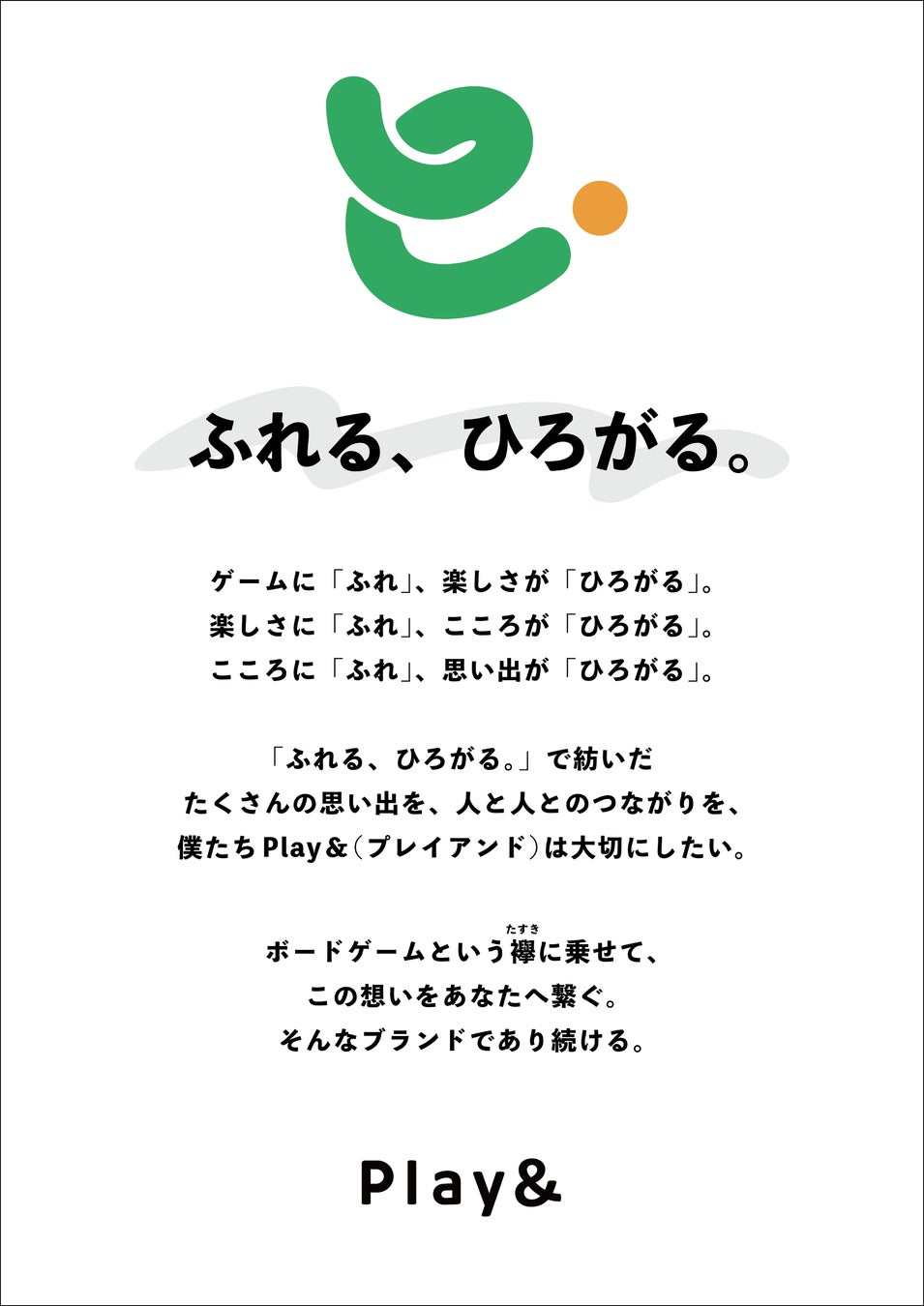 「Play&」は、「ふれる、ひろがる」をブランドコンセプトとし、ゲームを通して人と人とのつながりを深め、思い出を共有する瞬間を提供します。ブランドの使命は、ボードゲームにふれることで、楽しさや笑顔がひろがり、その楽しさが心にもひろがり、心温まるたくさんの思い出や、大事にできる人のつながりをつくり、襷(たすき)のように紡いでいくことです。