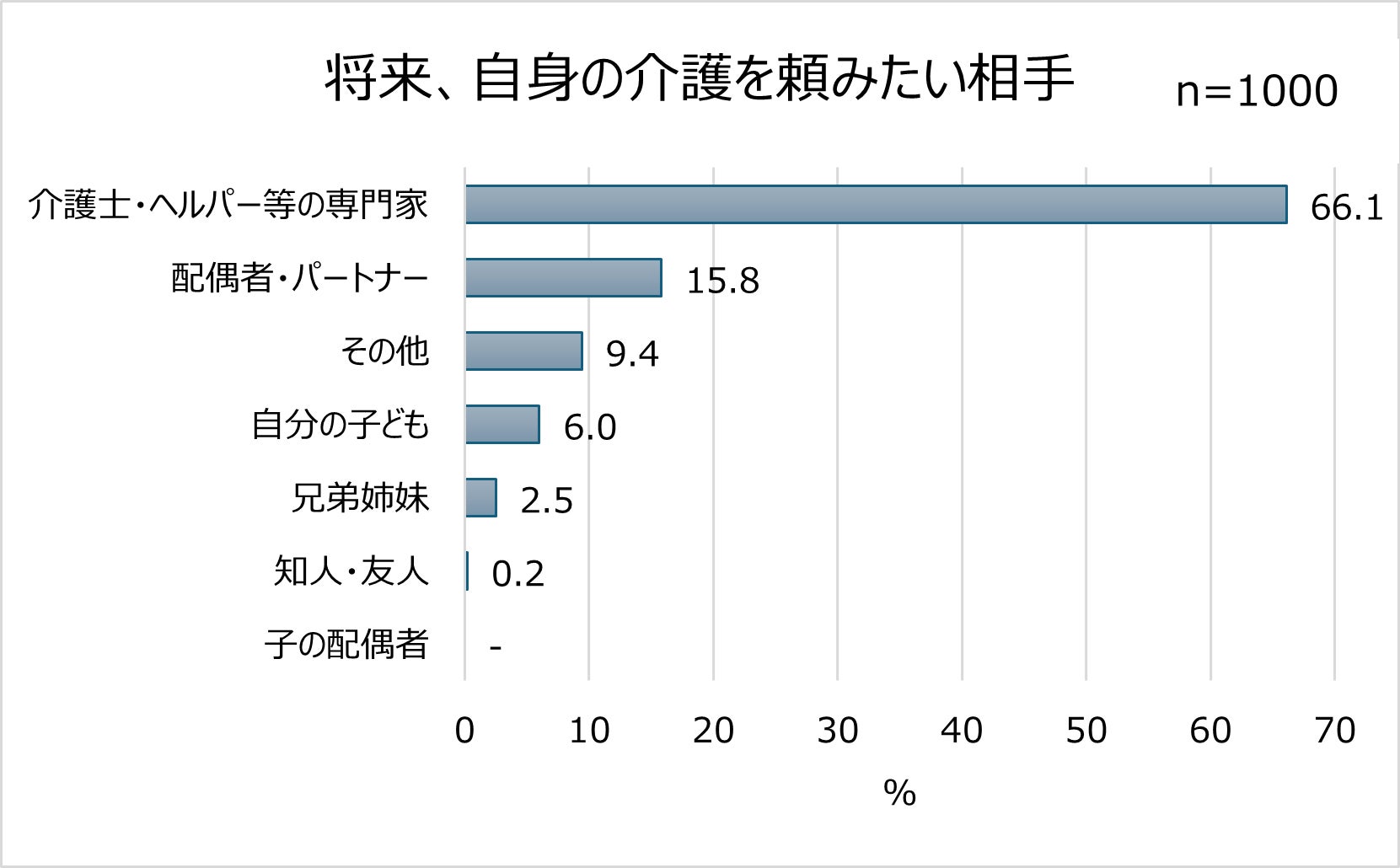また、「自分の子ども」と答えた人は、わずか6.0%。ほとんどの人は、自分の子どもに介護をしてもらいたいと考えていないことが明らかになりました。