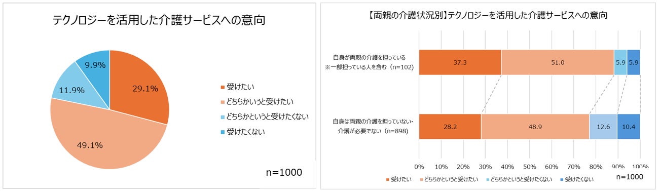 車イスのまま入れる入浴装置やおむつ内の排泄状況が分かるシステム、睡眠状態を測定するセンサー、床ずれを防止する装置など、介護を受ける人やその家族が快適かつ安心して過ごせるように、睡眠、入浴、排泄など生活に必要な項目において、テクノロジーが幅広く介護現場で活用されています。こうしたテクノロジーを取り入れた介護サービスについて「受けたい(29.1%)」「どちらかというと受けたい(49.1%)」を合わせると、8割近く(78.2%)の人が肯定的な回答をしました。自身で親の介護を担っている人(一部担っている人を含む)は特に割合が高く、「受けたい(37.3%)」「どちらかというと受けたい(51.0%)」を合わせて9割近い(88.3%)という結果になりました。実際に介護をしているからこその結果と言えそうです。