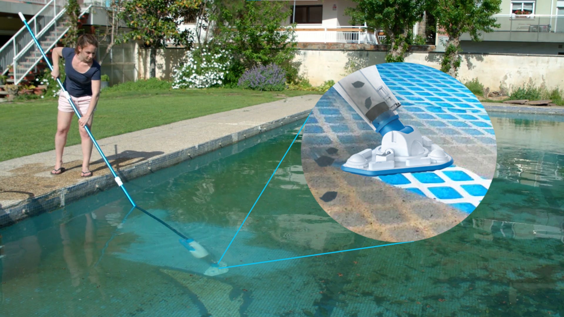 延長ポールを取り付ければ、 水に入らず清掃できる |