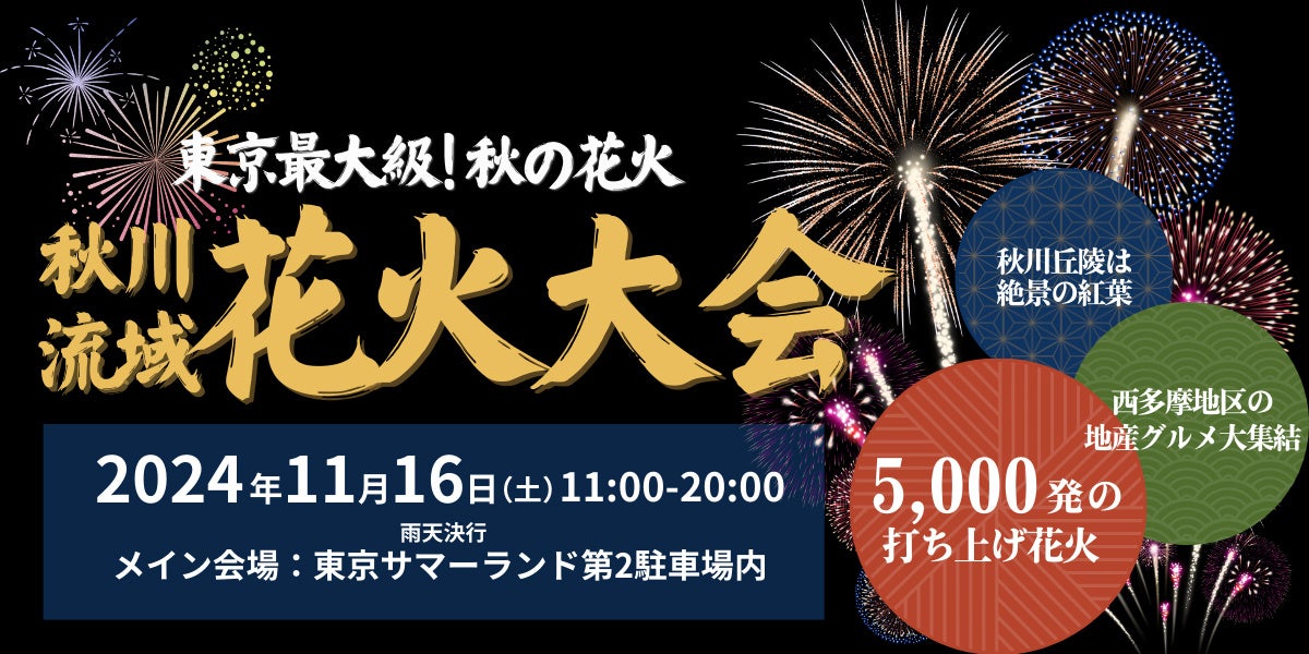 秋の花火大会としては東京最大級となる約5,000発の花火を打ち上げ予定で、東京サマーランドの第2駐車場が観覧席となります。飲食ブースでは秋川流域の地産・地消を活かした料理を提供し、日中の時間帯は地域のダンスチームによるパフォーマンスが披露されます。