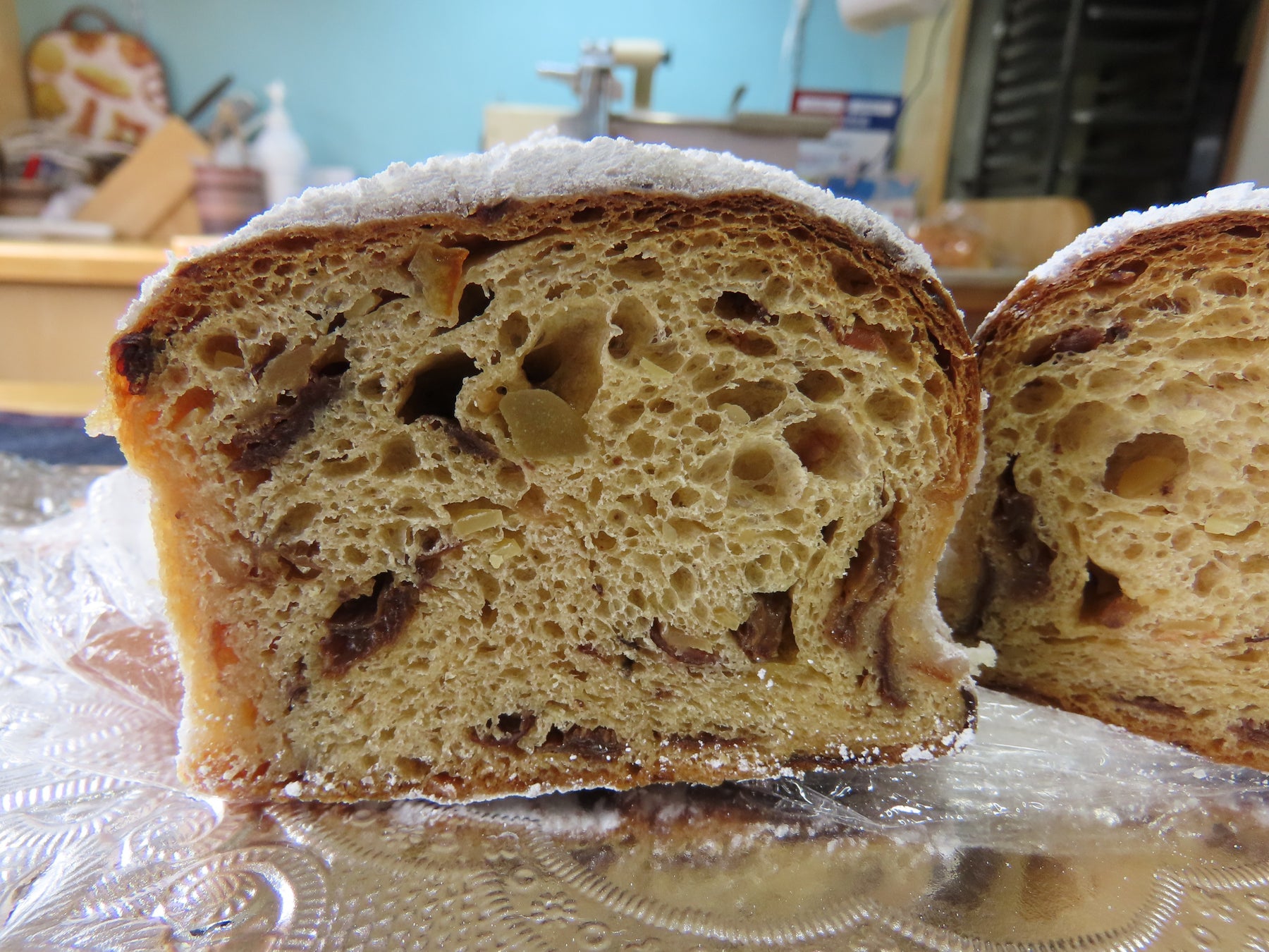 うさぱんやのシュトレンの特徴は、まずなんといっても、「“ところ狭し”に敷き詰められた、豊富な具材たち」。シュトレンの断面を切ってみると、外側から「アイシングシュガー層」、「バター層」、「生地の表層(焼き目)」、「生地の中層(複数スパイス)」、「材料」と、マニアックな“萌え断”を見ることができます。このうちの「材料」について、うさぱんやのシュトレンでは、自家製ラムレーズン、クランベリー、オレンジピール、シトロンピール、アーモンドなど、複数の具材たちが“ところ狭し”に練り込まれています。「いろんな具材を入れて、いろんな味・食感を楽しんでほしいから」という理由から、具材を豊富にしました。
