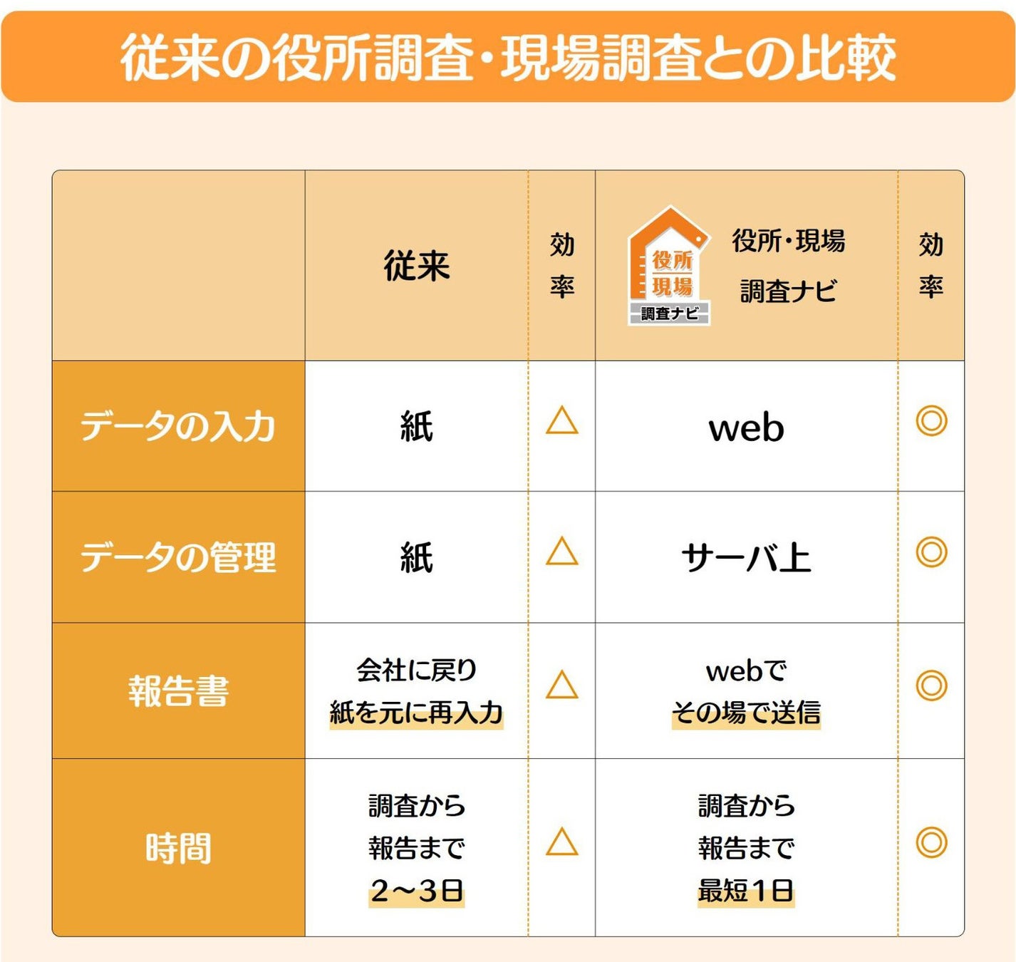 従来の調査方法と比較してみると、役所・現場調査ナビを使用することによって大幅な時間の短縮ができることがわかります。また、紙に手書きで書く方法だと文字が崩れてしまったり、書く人によって読みにくくなったりします。役所・現場調査ナビの場合、誰でも正確に調査内容を入力することができます。