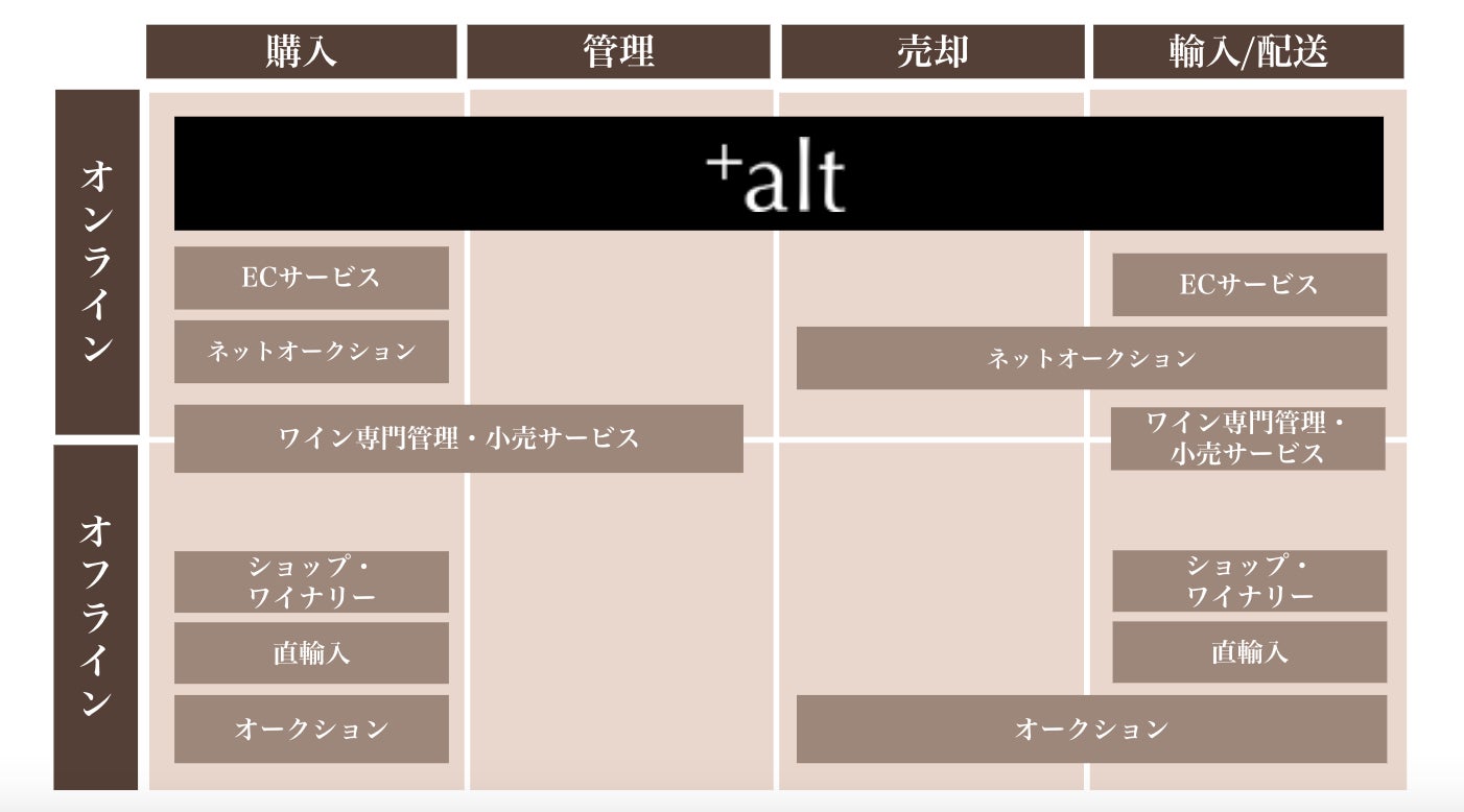 事業の核としてワインの蒐集、管理、売却を可能にするデジタルプラットフォーム「+alt(プラスオルト)」を展開し、日本語環境で世界中のプレステージワインにアクセスできる環境を提供しています。