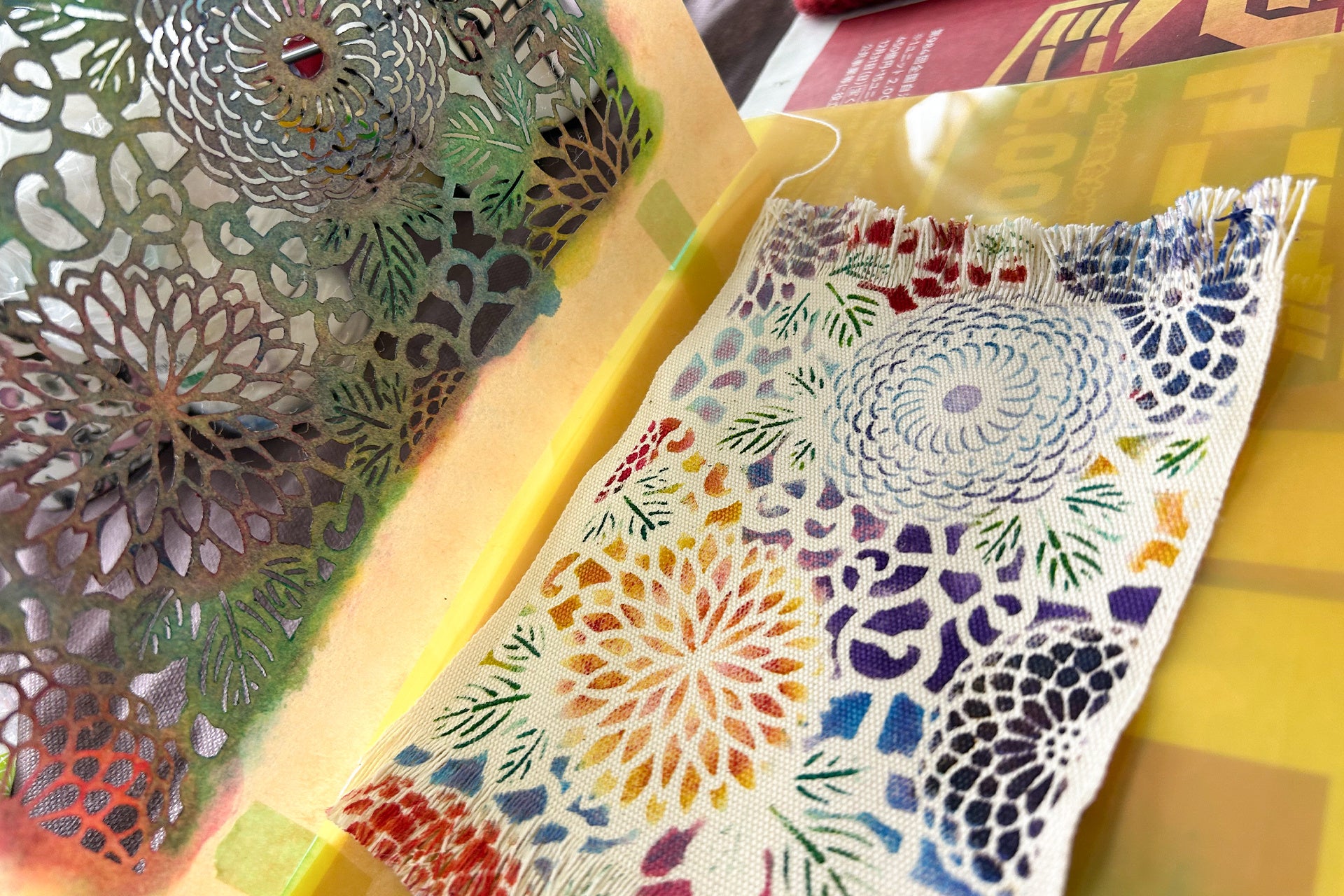 布、和紙、「木工房三澤」で作ったコースターの型染め体験