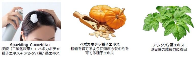 独自処方の「Sparkling-Cucurbita+(スパークリングククルビタ)」(※2)により、頭皮と毛髪に関する様々な悩みに対応したエイジングケアを1本で可能にしました。独創的かつダイナミックな発想で、見た目年齢の若返りを目指します。