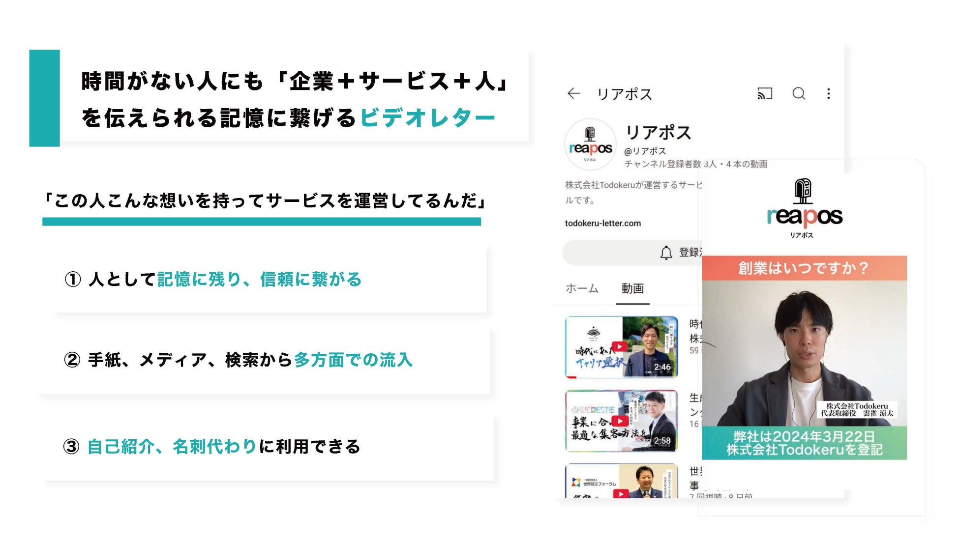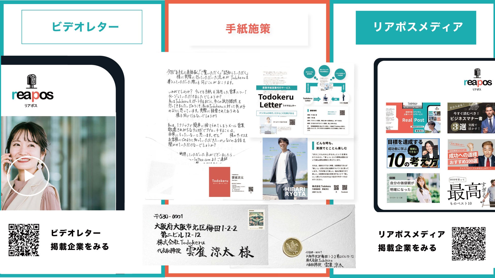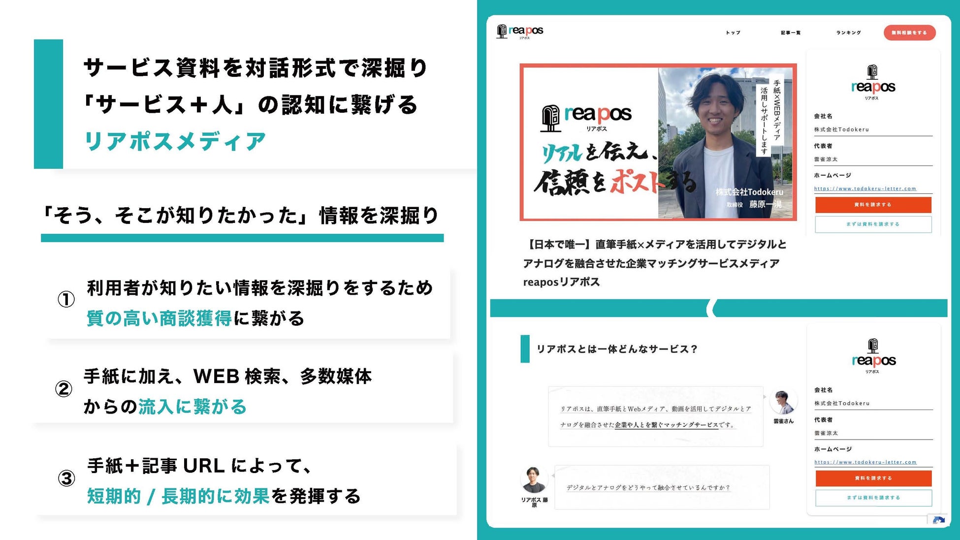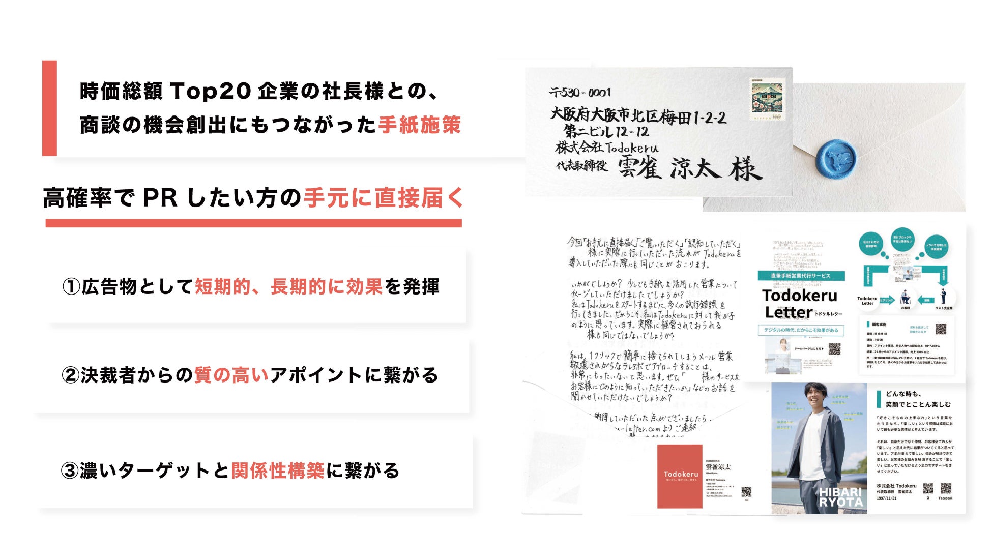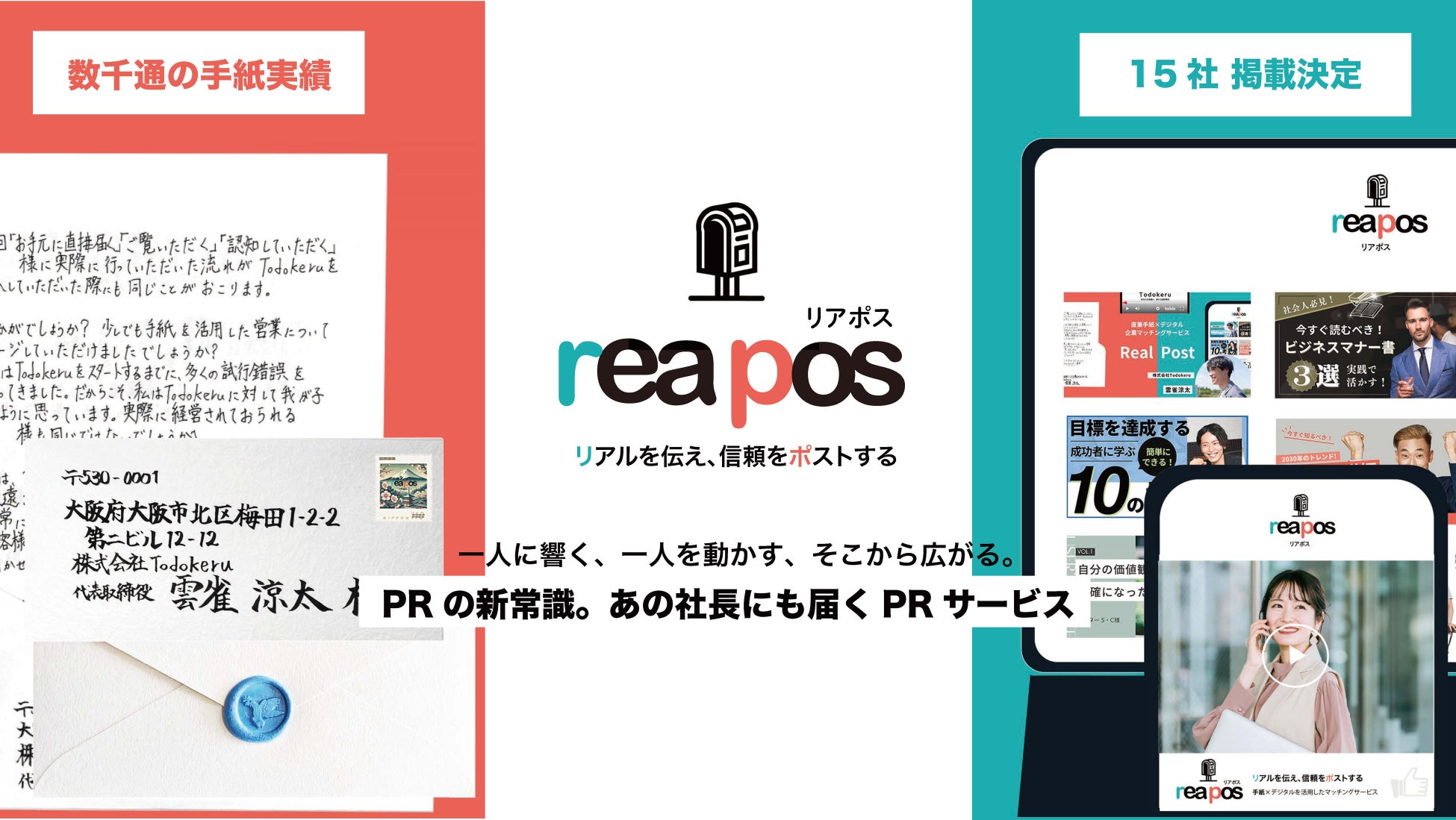 弊社は「上場企業の社長様との商談機会の創出にもつながるなど数千通の手紙実績をもつ」レターデジタルマーケティングサービスを展開する株式会社Todokeruです。この度、直筆手紙×Webメディアを組み合わせた「あの社長にも届くPRサービス リアポス」をリリースしました。