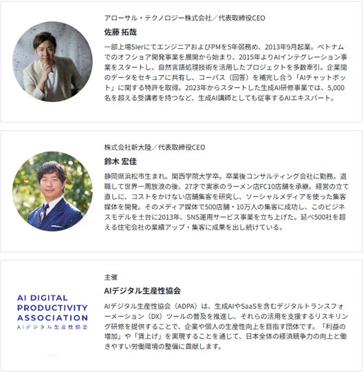 一般社団法人AIデジタル生産性協会(代表理事:前田 一成、運営会社:DXHR株式会社、以下「ADPA」)は、2024年11月28日(木)16:00より、オンラインにて「AI活用実体験から語る!AI導入2年で組織と仕事に起きた劇的変化とは?」と題したセミナーを開催いたします。