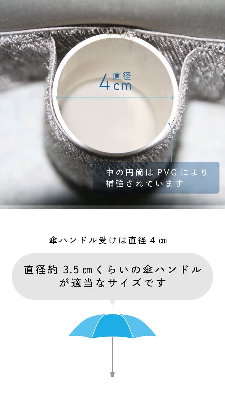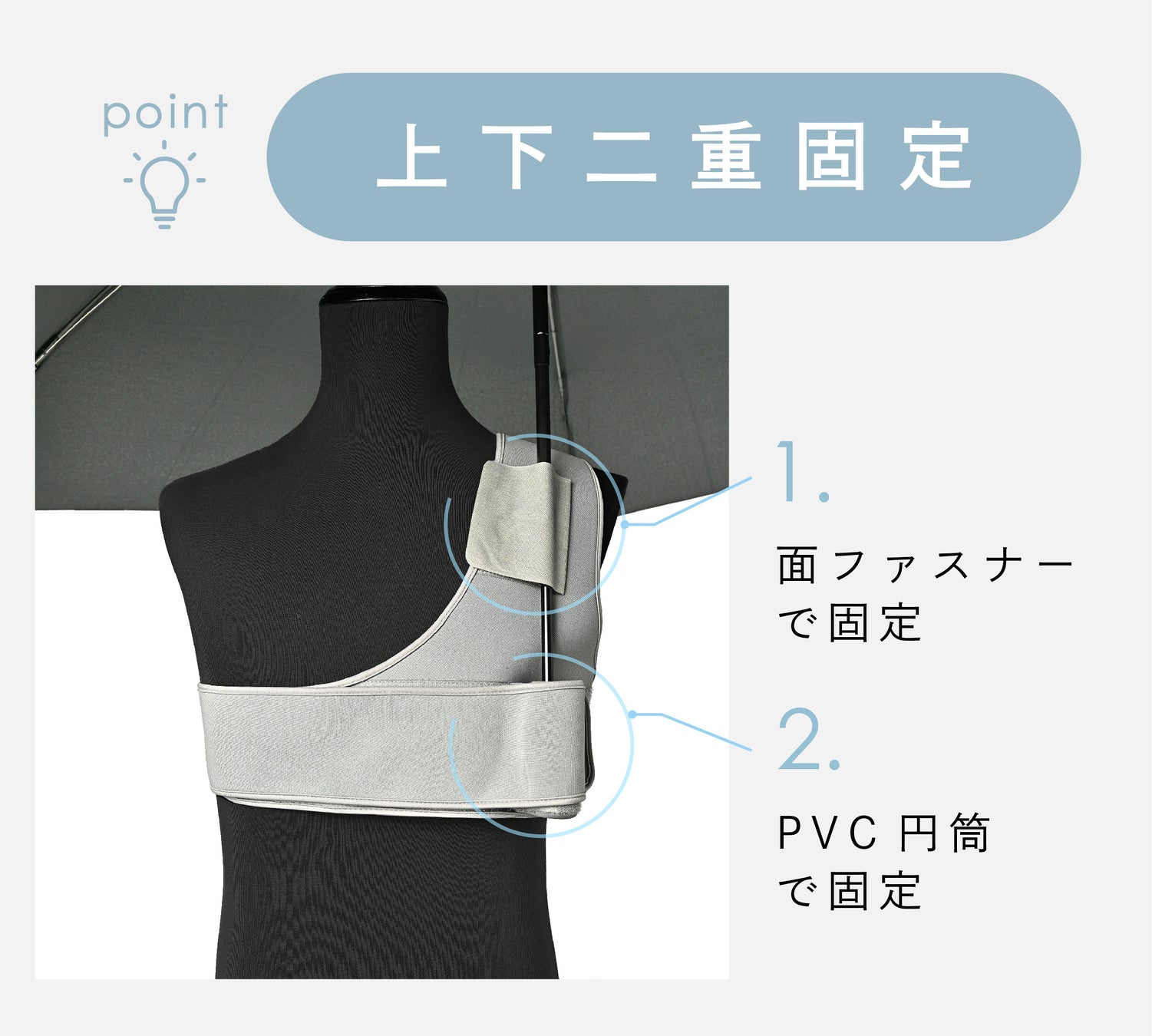1、誰でも身体にしっかりフィット!新たに独自補強したPVC円筒と面ファスナーで二重固定の傘ホルダー
