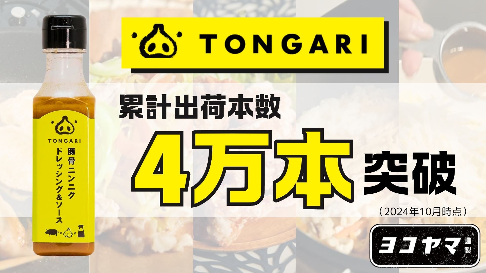 「食卓に新たな選択肢を」をコンセプトに加工食品の企画販売を行う株式会社YOKOYAMA(本社: 東京都新宿区、代表取締役: 横山淳一)は、2023年5月に同社が販売を開始した豚骨ニンニクドレッシング&ソース「TONGARI」(希望小売価格 税抜650円)の累計出荷本数が4万本を突破したことをお知らせします。