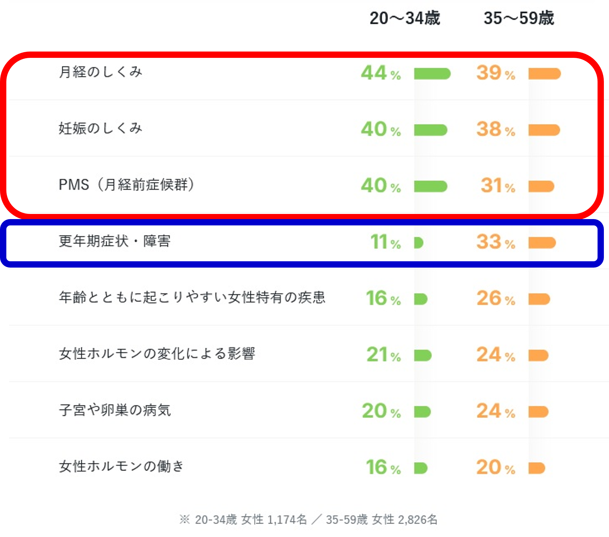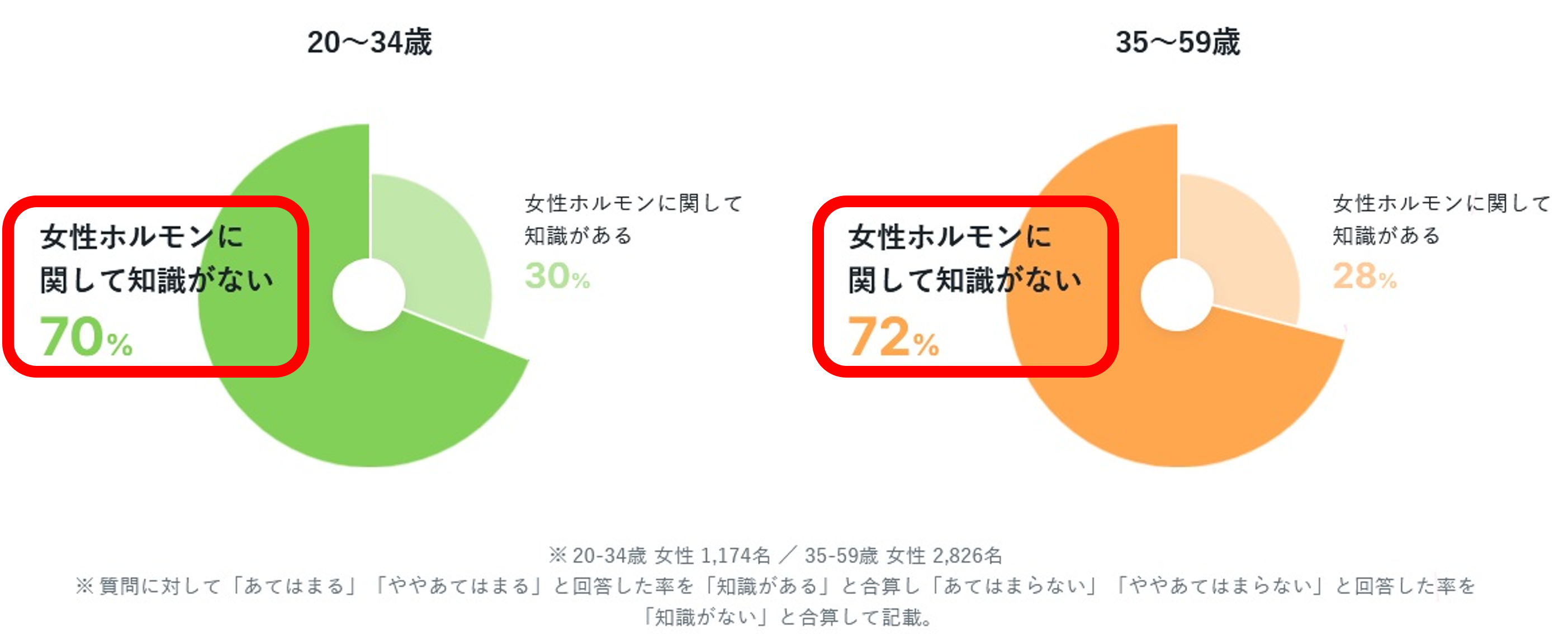 PMS(月経前症候群)や更年期の諸症状など女性特有の健康問題は、女性ホルモンの変化が原因で起こりますが、その根幹とも言える女性ホルモンについて、両年代ともに7割以上の人が「知識がない」と回答しました。(赤枠)