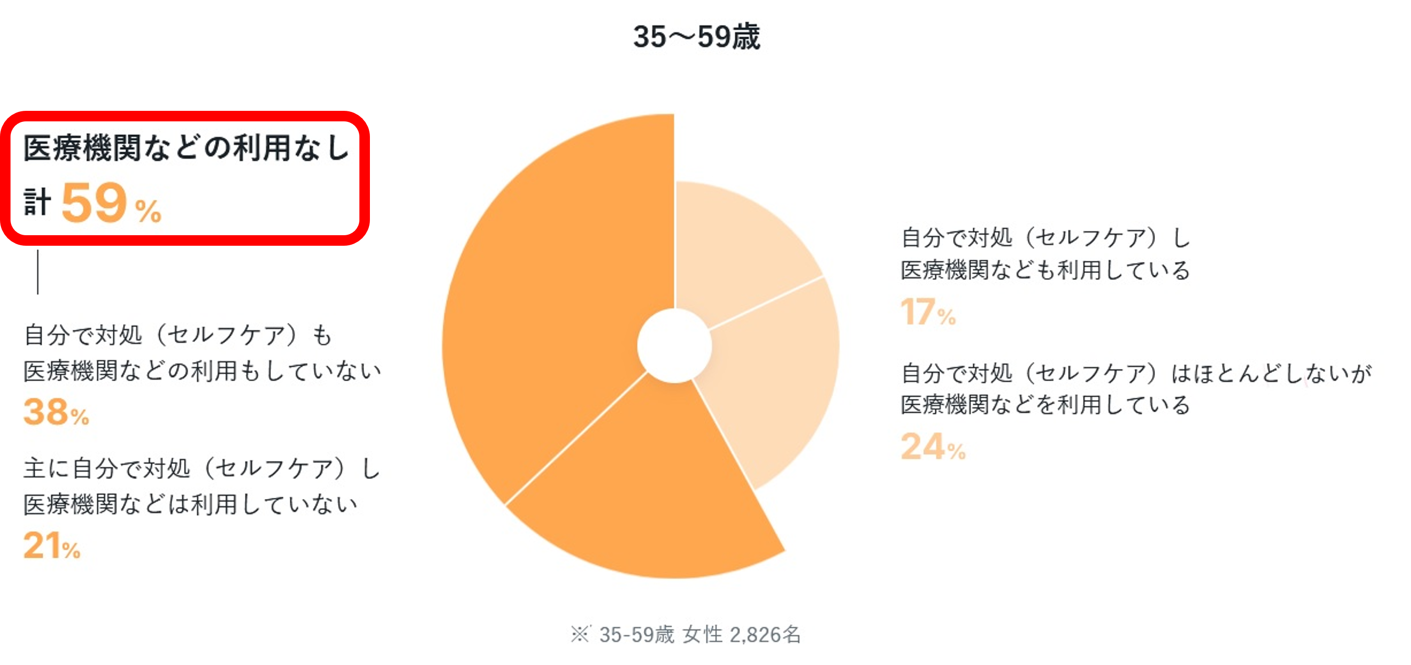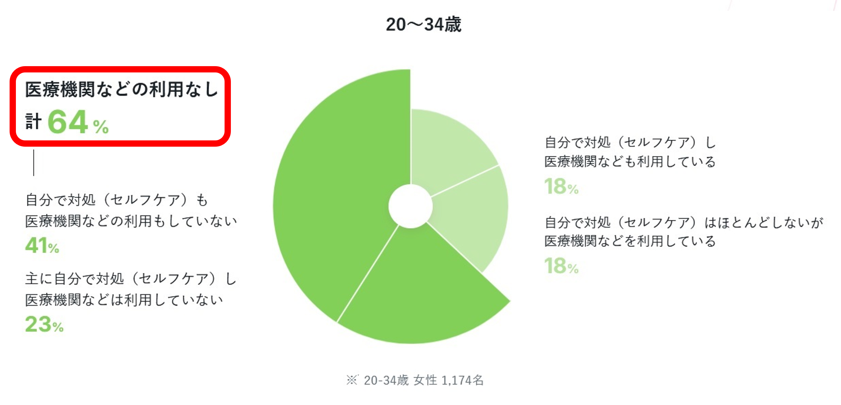 女性ホルモンのサイクルや年齢によって変化する女性のからだ。その変化は年齢と共に移り変わり、ライフステージ毎に様々な心身の不調をもたらすこともあります。そんな女性特有の不調に対し、医療機関などは利用していないと回答した人は両年代で約6割に及びました。(赤枠)