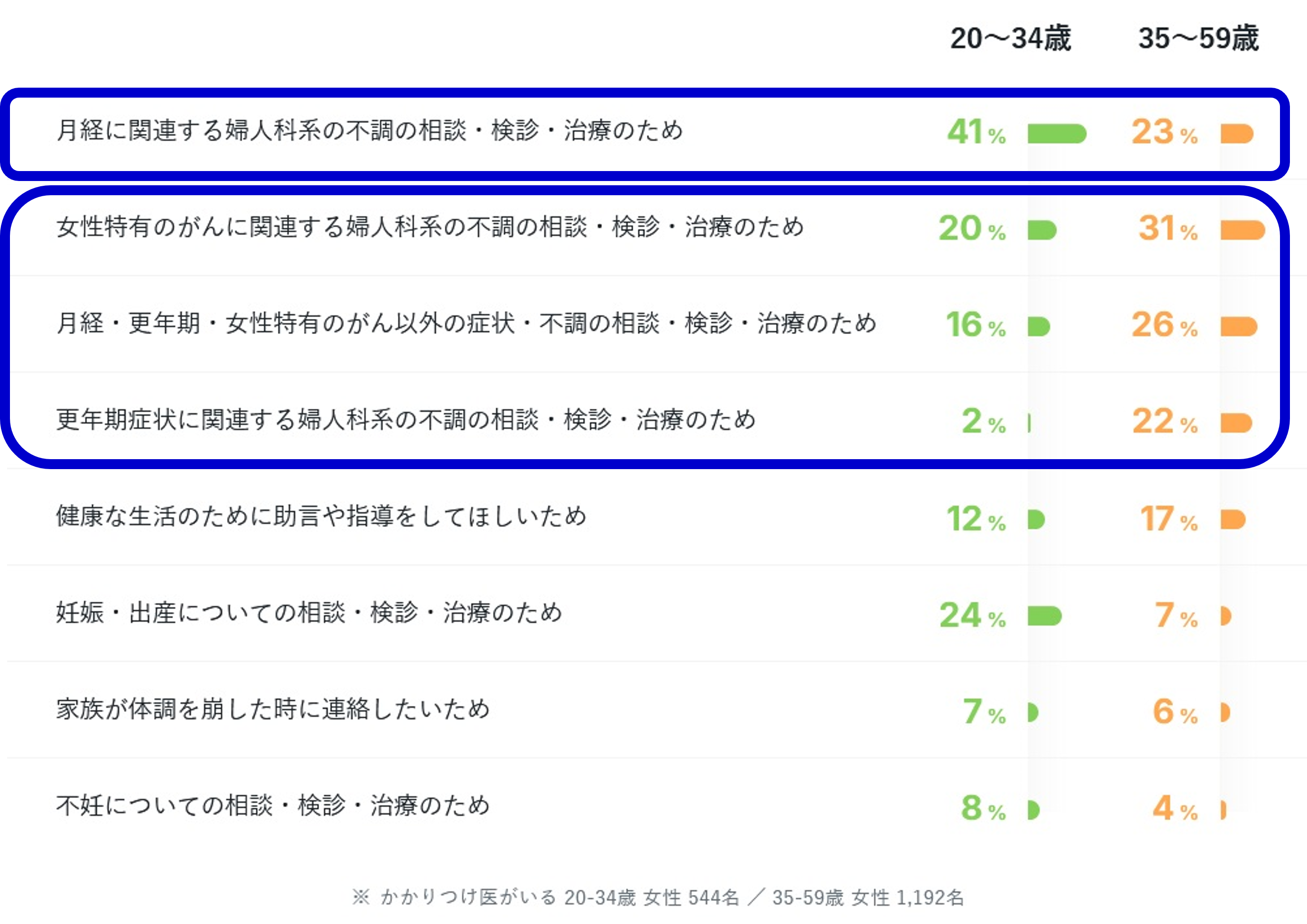 一方、35~59歳では、女性特有のがん、月経・更年期・女性特有のがん以外の症状・不調、そして、更年期症状についての相談・検診・治療のためという回答割合が高い結果となり、かかりつけ婦人科医がいる理由は、年代によって異なることがこの調査から明らかとなりました。(青枠)