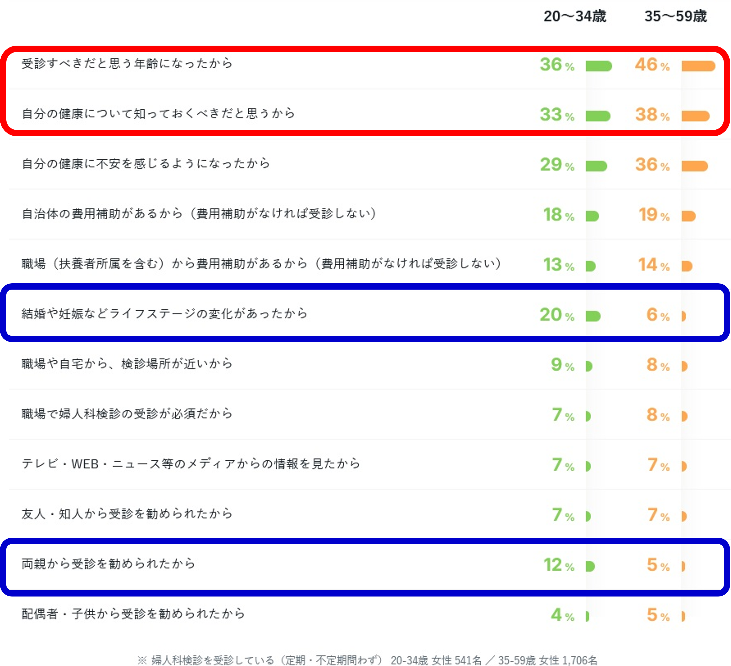 ただし、20~34歳においては、ライフステージの変化や、両親からの受診の勧めが、受診の理由として30~59歳よりも回答割合が高くなる結果に。(青枠)