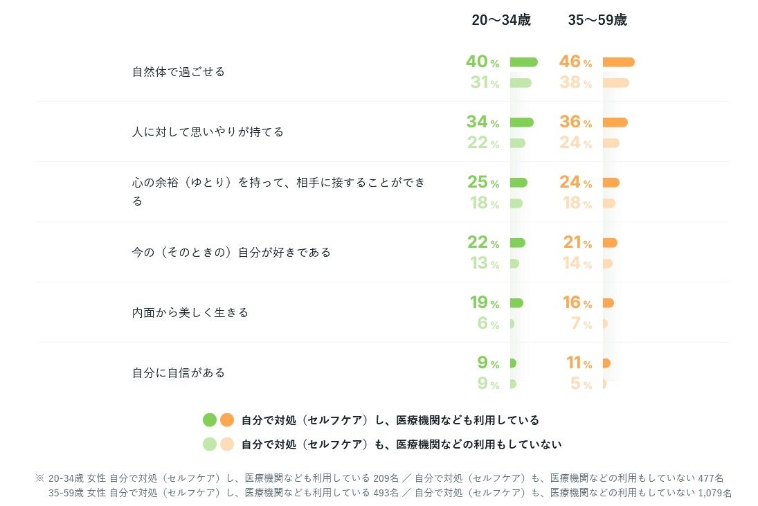 日々の生活について聞いたところ、両年代共に、一般的なセルフケアに加えて、医療機関も利用している人は、「自然体で過ごせる」「人に対して思いやりが持てる」「心に余裕が持てる」など、現在の生活に対する満足度が高いことが伺えます。