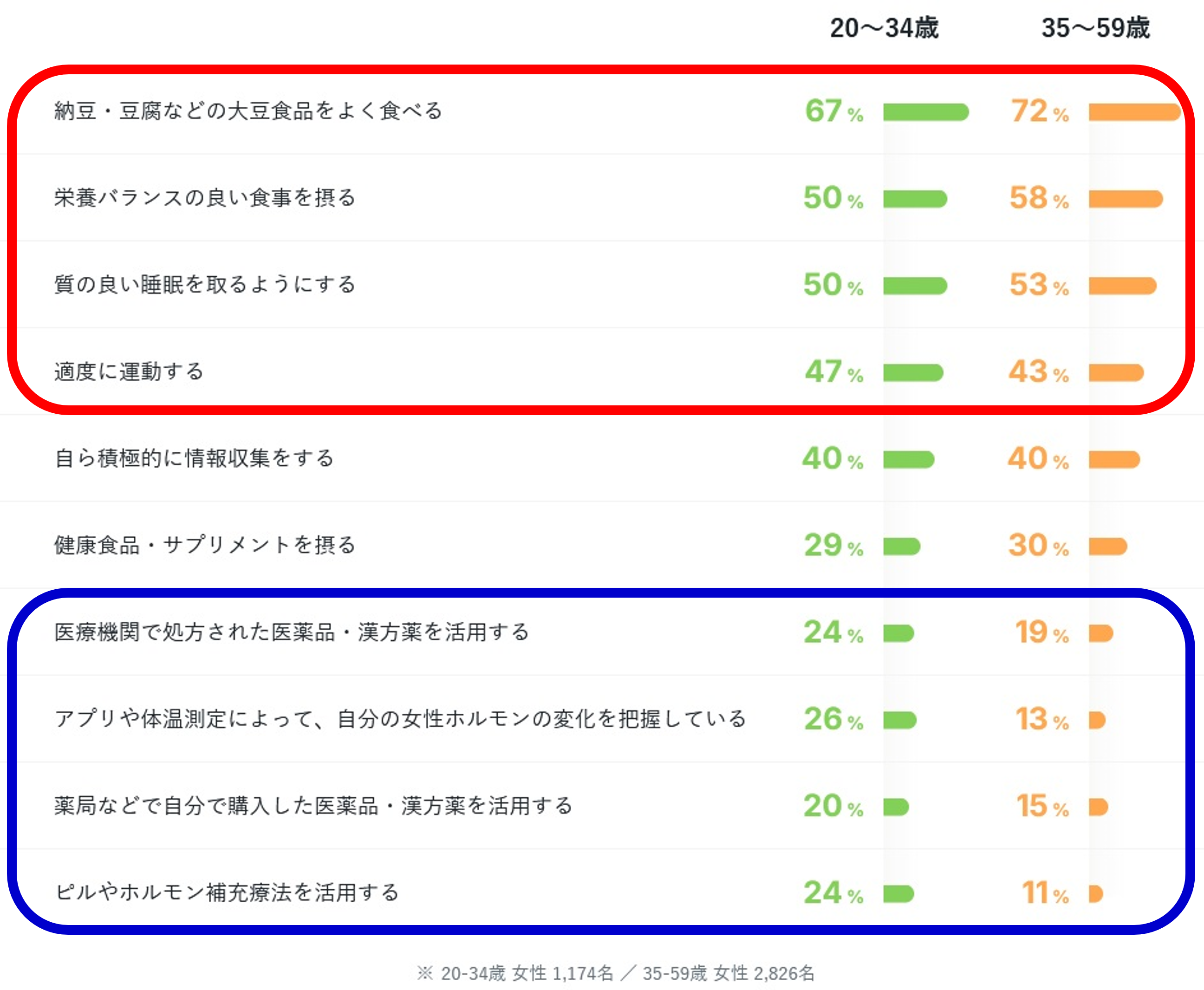 女性ホルモンのためにどのような対処・対応を行っているかを聞いたところ、両年代共に「納豆・豆腐などの大豆食品をよく食べる」が最も高く、次いで「栄養バランスの良い食事」、「質の良い睡眠」、「適度な運動」という健康三原則が次ぐ結果に。(赤枠)
