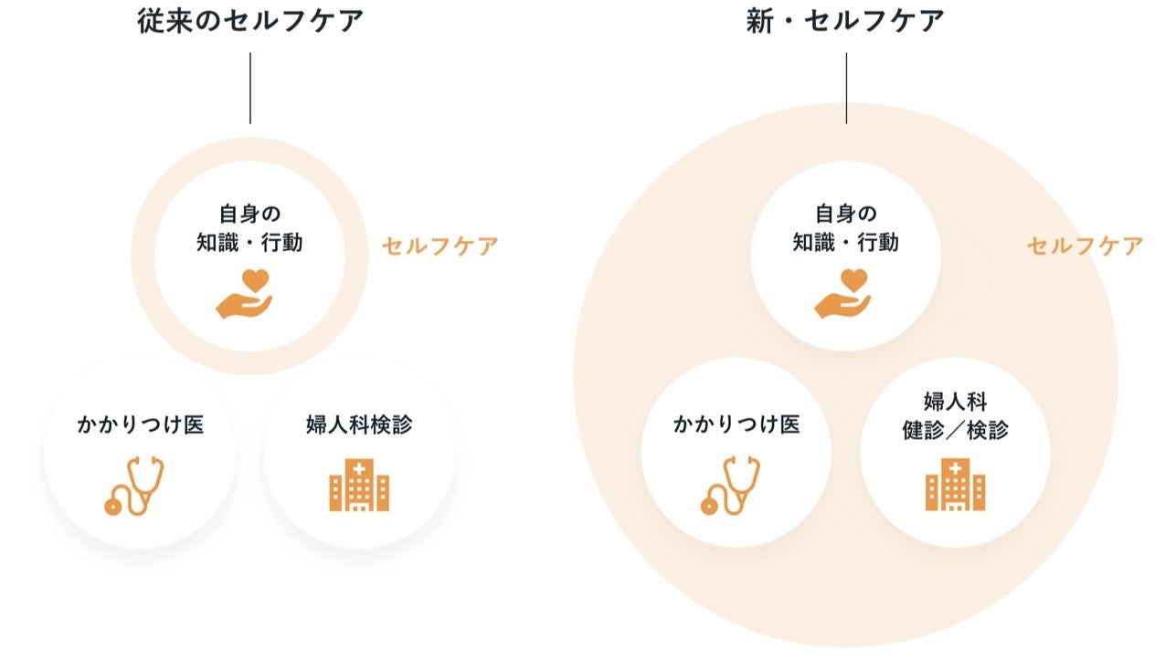 従来の「セルフケア」は、女性特有の症状と深く関わる女性ホルモンに関する正しい知識を身に付け、バランスの取れた食生活や適度な運動、睡眠、サプリメントの利用などを指しましたが、「新・セルフケア」は、これと共に、「婦人科検診/健診」、「かかりつけ医」という“医療専門家”のサポートを合わせることを指します。