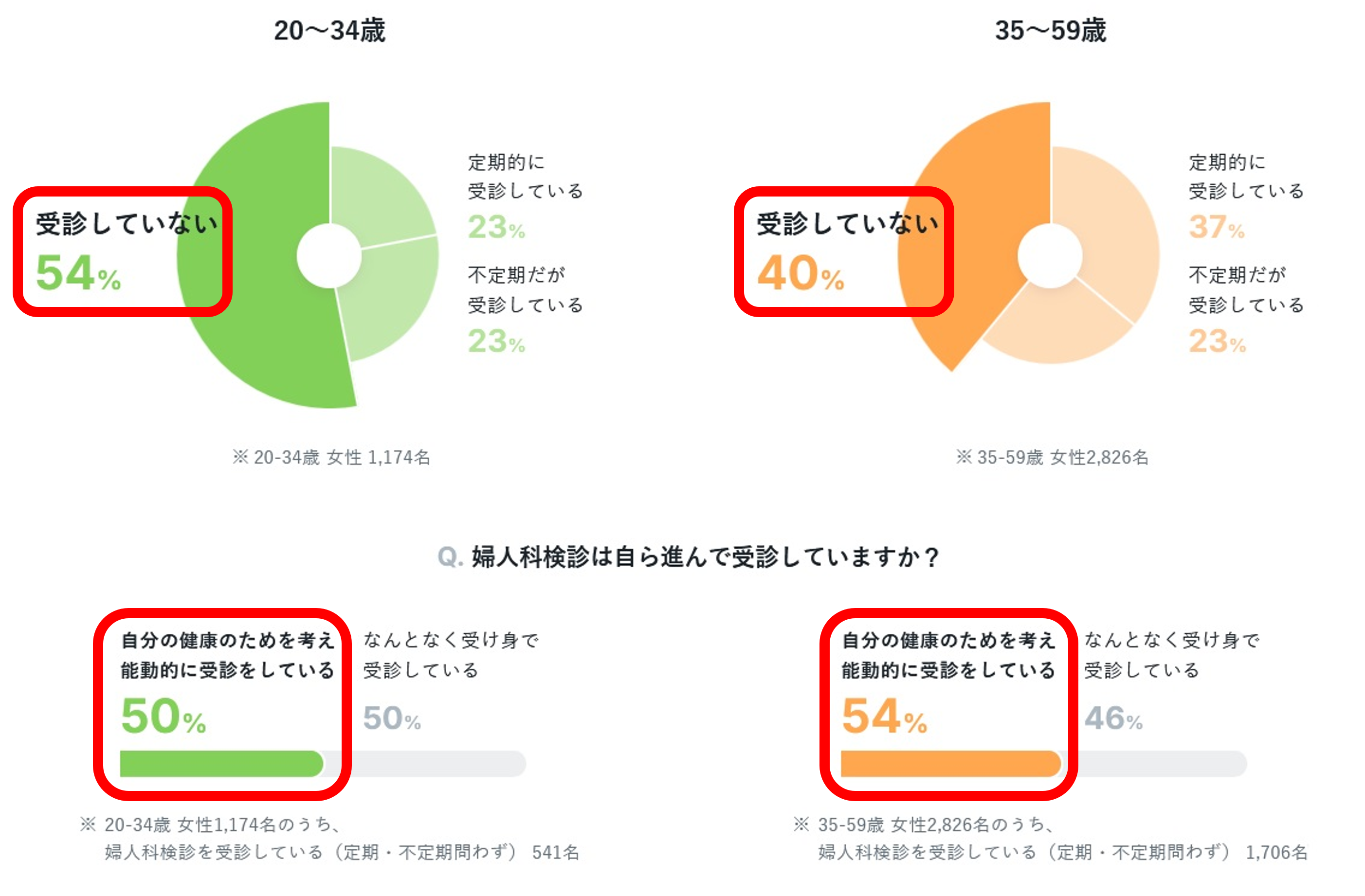自身の健康状態を知るために重要な婦人科検診。しかし、婦人科検診を受診していない人は、20~34歳で5割以上、35~59歳では4割いることが今回の調査で分かりました。(赤枠)