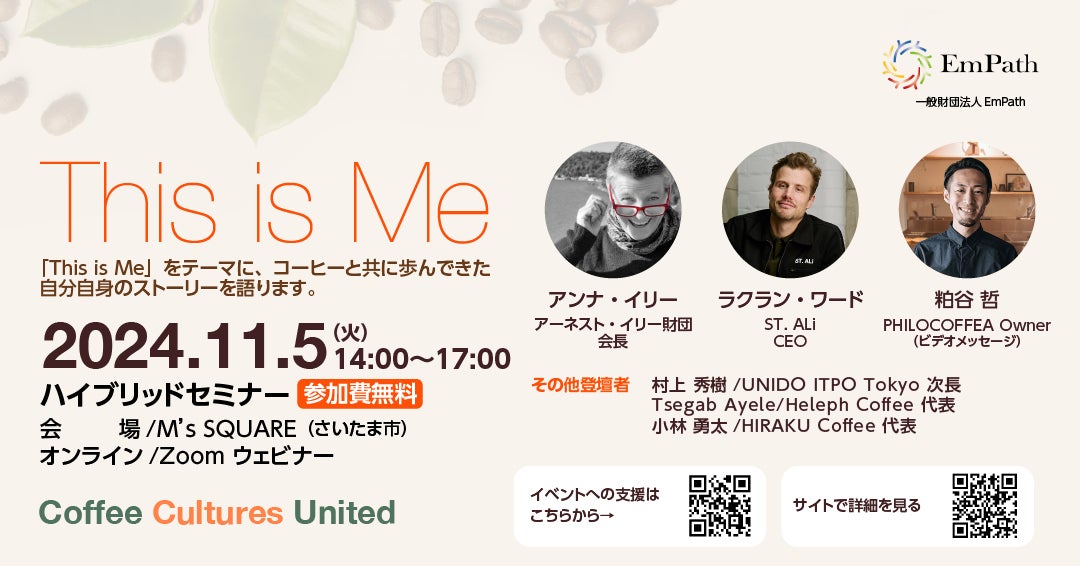 財団法人EmPath(埼玉県久喜市河原井19、代表理事:松浦 広展)は、武蔵野銀行が運営するM’s SQUARE(埼玉県さいたま市)とZoomによるハイブリッド方式で、コーヒーの多様性と国際連携で築く持続可能な未来を描く「This is Me ~Coffee Cultures United~」を、2024 年 11 月 5 日(火)に開催いたします。
